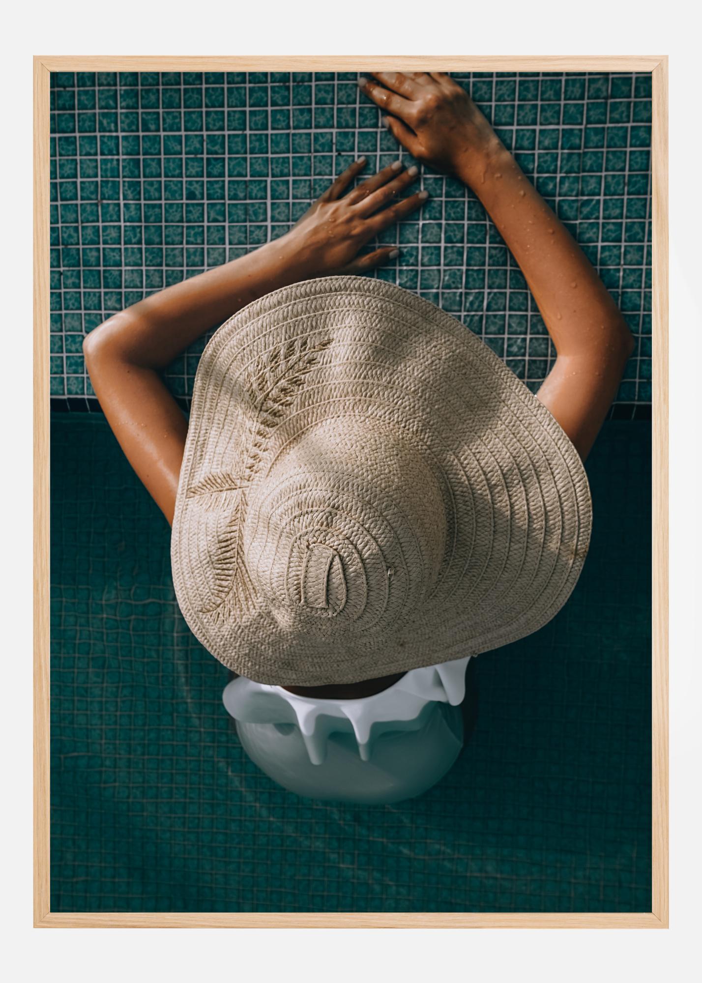 Les détails du chapeau et de la surface de l'eau miroitante, combinés aux ombres douces et à l'ambiance ensoleillée, évoquent une sensation de journées d'été paresseuses et de longs moments de vacances agréables. C'est une affiche idéale pour la salle de bain, un espace de type spa, ou tout autre endroit où l'on souhaite apporter une sensation de détente et d'évasion du quotidien.