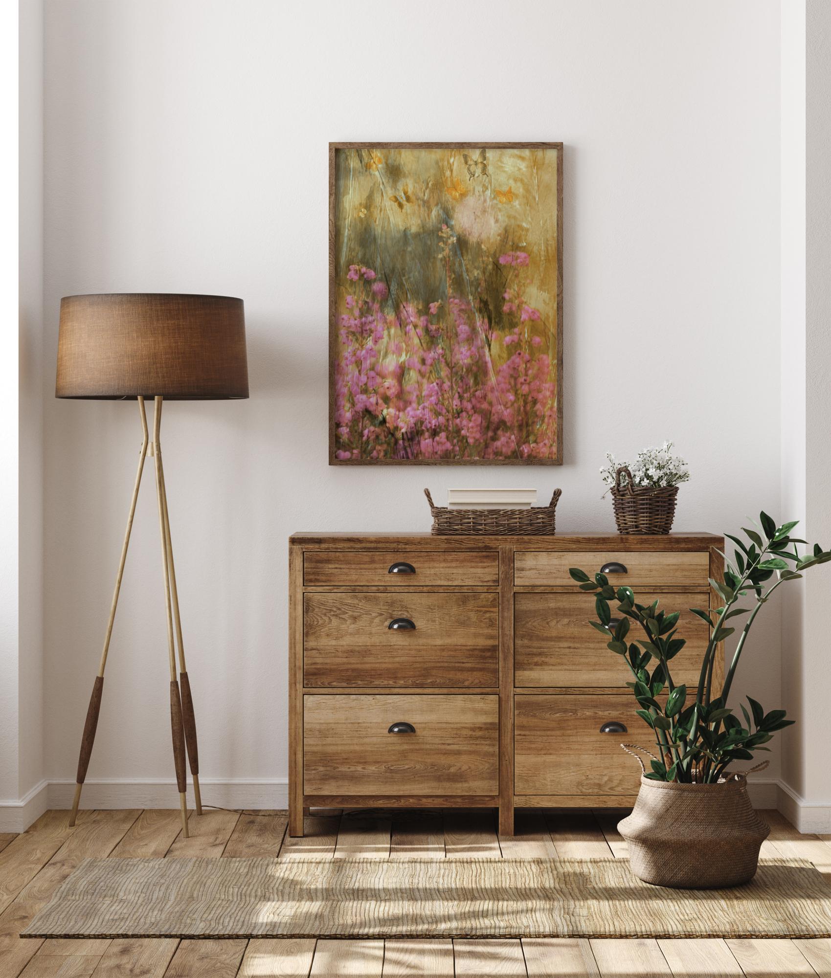 Une belle impression printanière représentant des herbes séchées roses et brunes dans un champ. Les douces couleurs pastel donnent un ton relaxant et paisible. Les fleurs pastel roses et douces remplissent l'image, avec les beaux papillons bruns qui planent à l'arrière-plan. Une affiche pour toutes les pièces de la maison pour apprécier la nature.