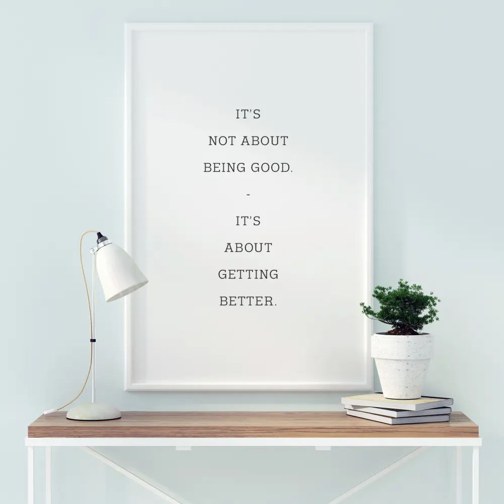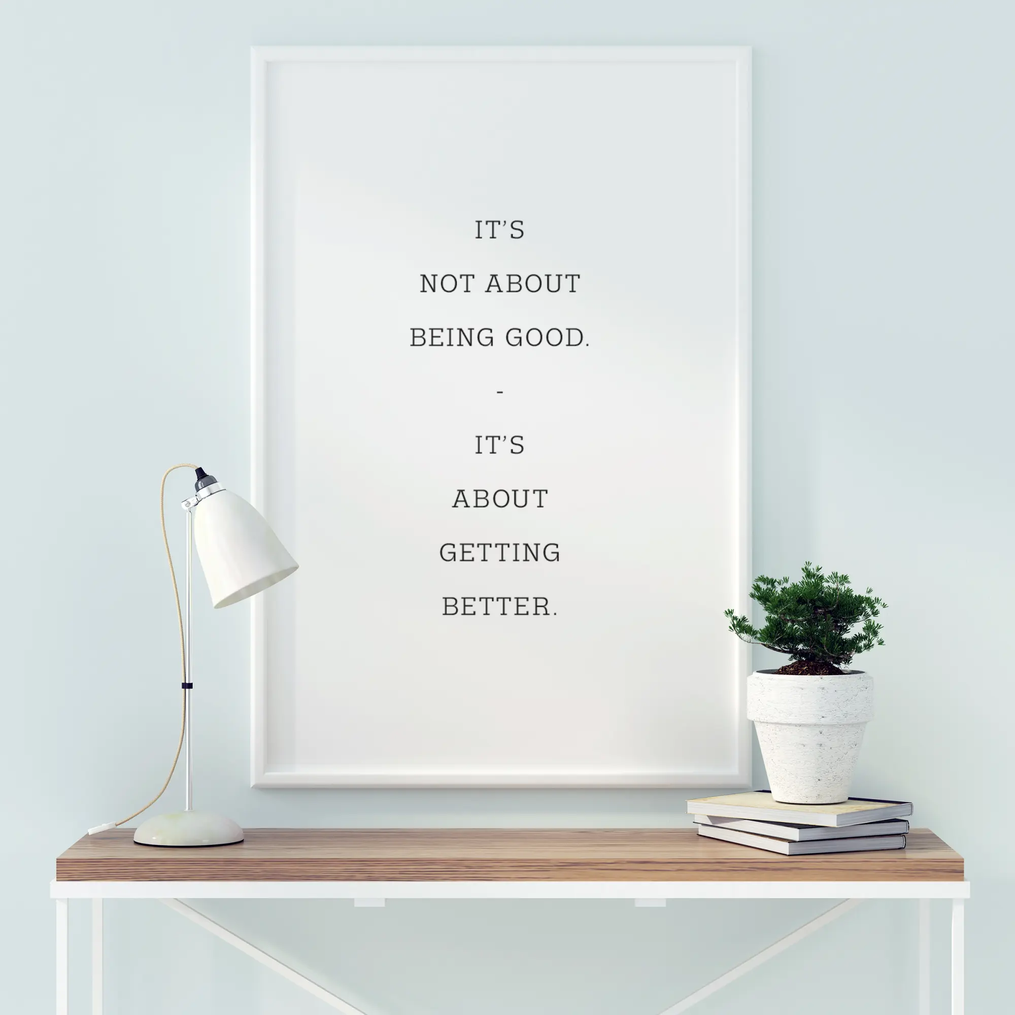 Une affiche motivante en noir et blanc avec un message simple, mais efficace. “It's not about being good, it's about getting better” pour “Il ne s'agit pas d'être bon, il s'agit de s'améliorer”. Un message simple d'encouragement pour affronter la vie calmement dans le but de s'améliorer dans les tâches quotidiennes. Une citation d'encouragement pour celui qui la lit.