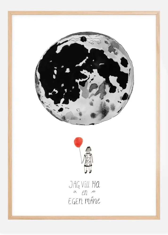 Une simple affiche en noir et blanc d'une petite fille debout sous la planète. Vêtue d'une robe à pois noirs et blancs, elle tient un ballon orange. “Je veux ma propre lune”, tel est le message qu'elle veut transmettre. Une impression parfaite à accrocher dans la chambre d'un enfant.
