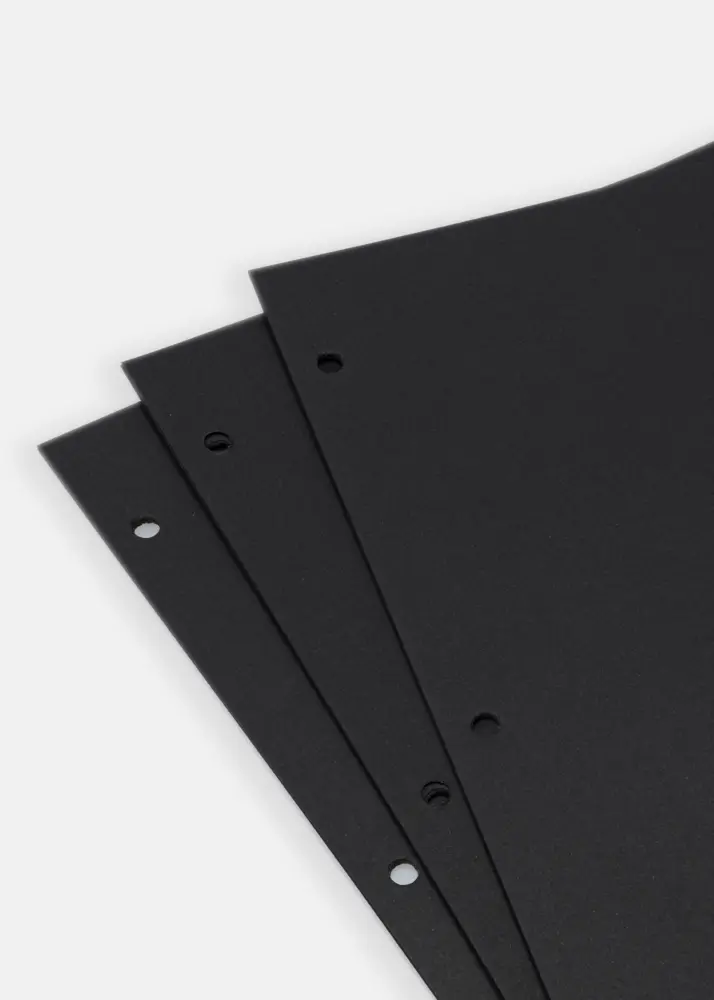 Feuilles d'album correspondant à notre série d'albums tendances KAILA Coffee Table Album XL. Ces feuilles noires ont leur côtés perforés pour faciliter leur assemblage dans le classeur de l'album. Vous collez vous-même vos photos préférées sur les pages, ce qui vous permet de laisser libre court à votre créativité dans la façon dont vous allez placer vos photos.