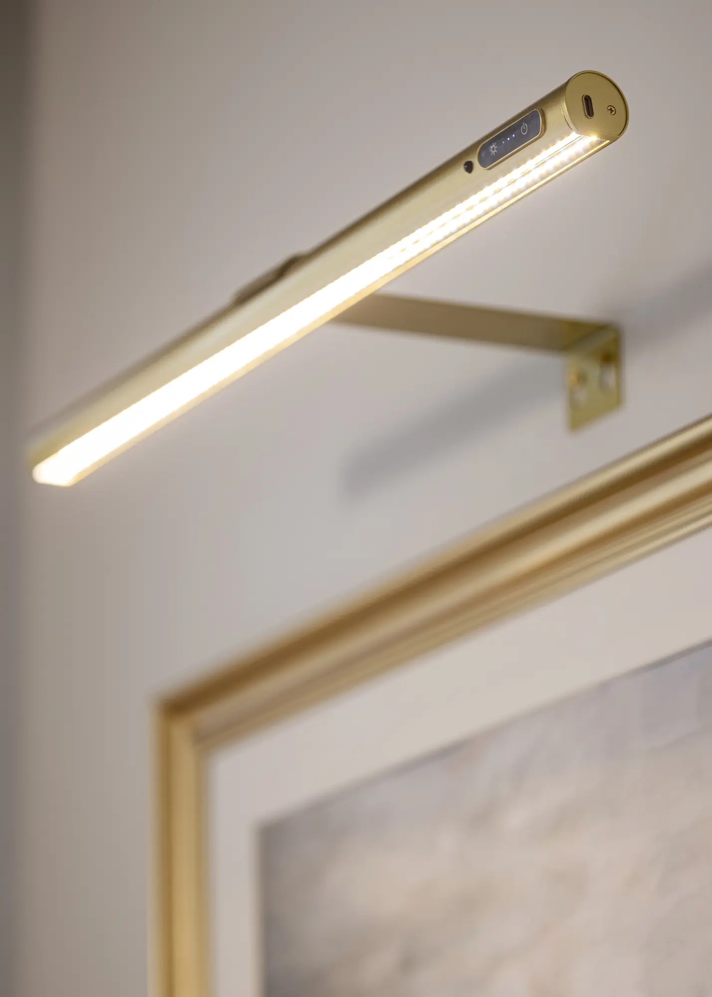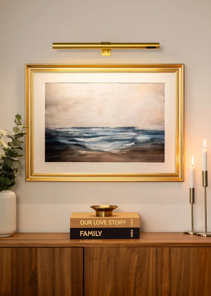 KAILA Halo est un éclairage d'image élégant et alimenté par batterie en or, parfait pour éclairer vos œuvres d'art sans câbles gênants. Grâce à son design sans fil, vous pouvez le placer n'importe où sans vous soucier des prises électriques. La finition dorée élégante donne une expression exclusive, tandis que la lumière se diffuse uniformément pour mettre en valeur les détails et les couleurs de manière magnifique. Facile à monter et pratique à utiliser - une solution pratique pour donner à vos tableaux l'attention qu'ils méritent.