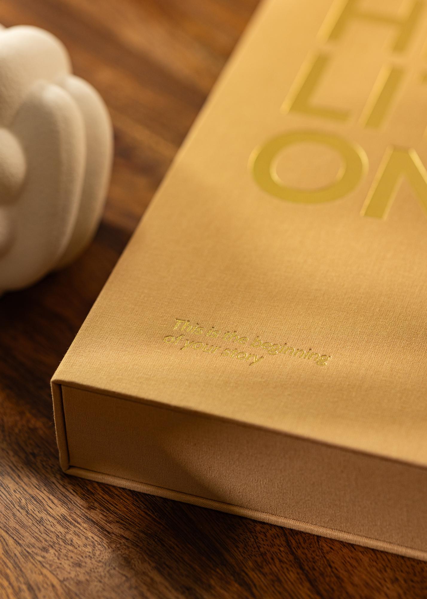L'album est conçu comme une boîte recouverte de textile que vous pouvez facilement ouvrir pour y jeter un œil et elle se présente dans une superbe teinte manille. Lorsque vous ouvrez l'album, vous êtes accueilli par un joli et discret imprimé sur l'intérieur de la couverture et un classeur à anneaux avec 30 feuilles noires (60 pages) que vous pouvez remplir de jolis souvenirs photo. Vous collez vous-mêmes vos photos ce qui vous offre de l'espace à la fois pour de la flexibilité et pour votre créativité.