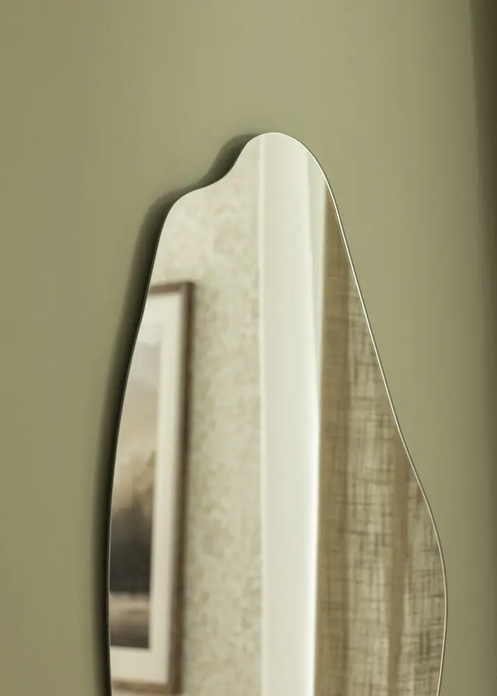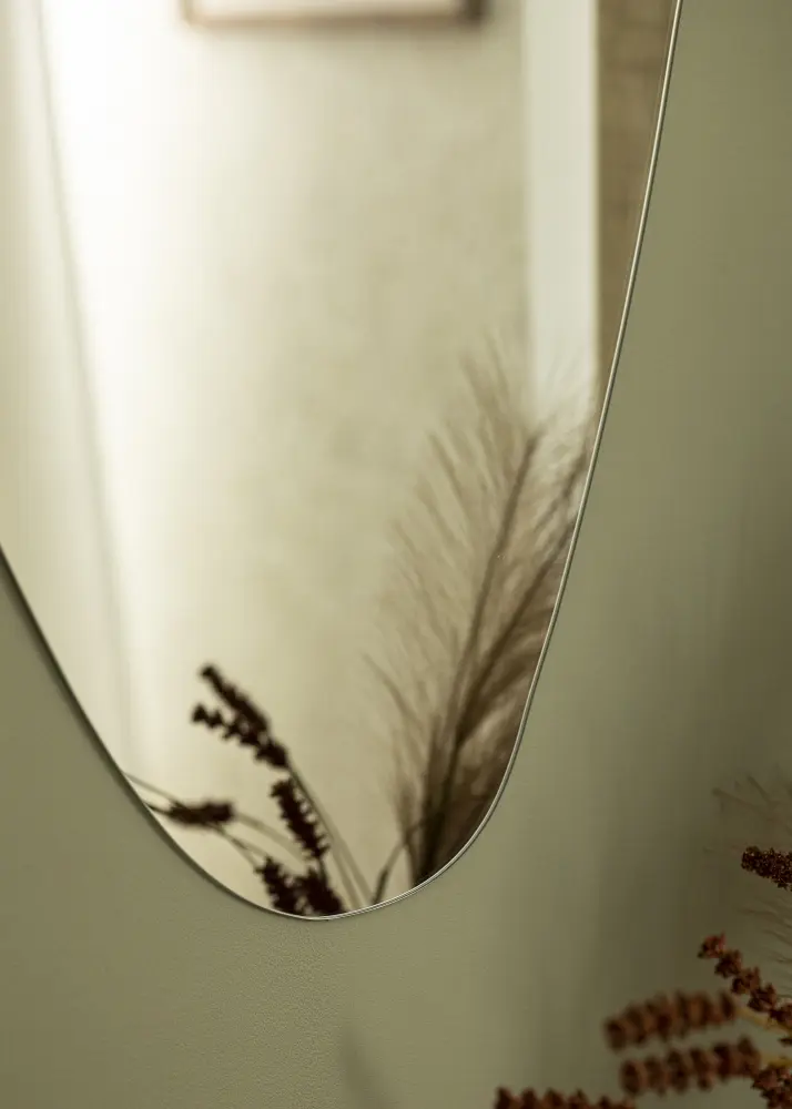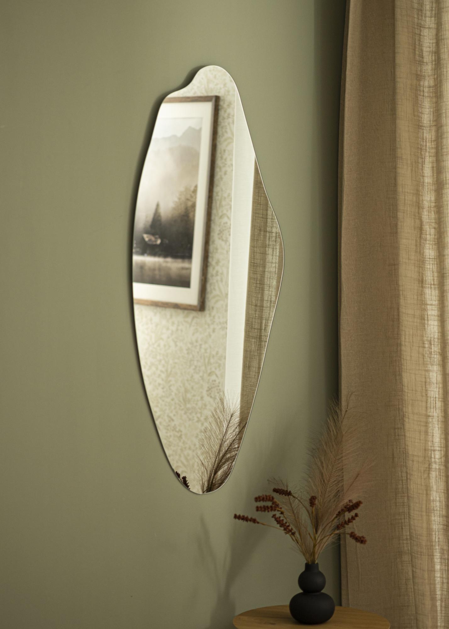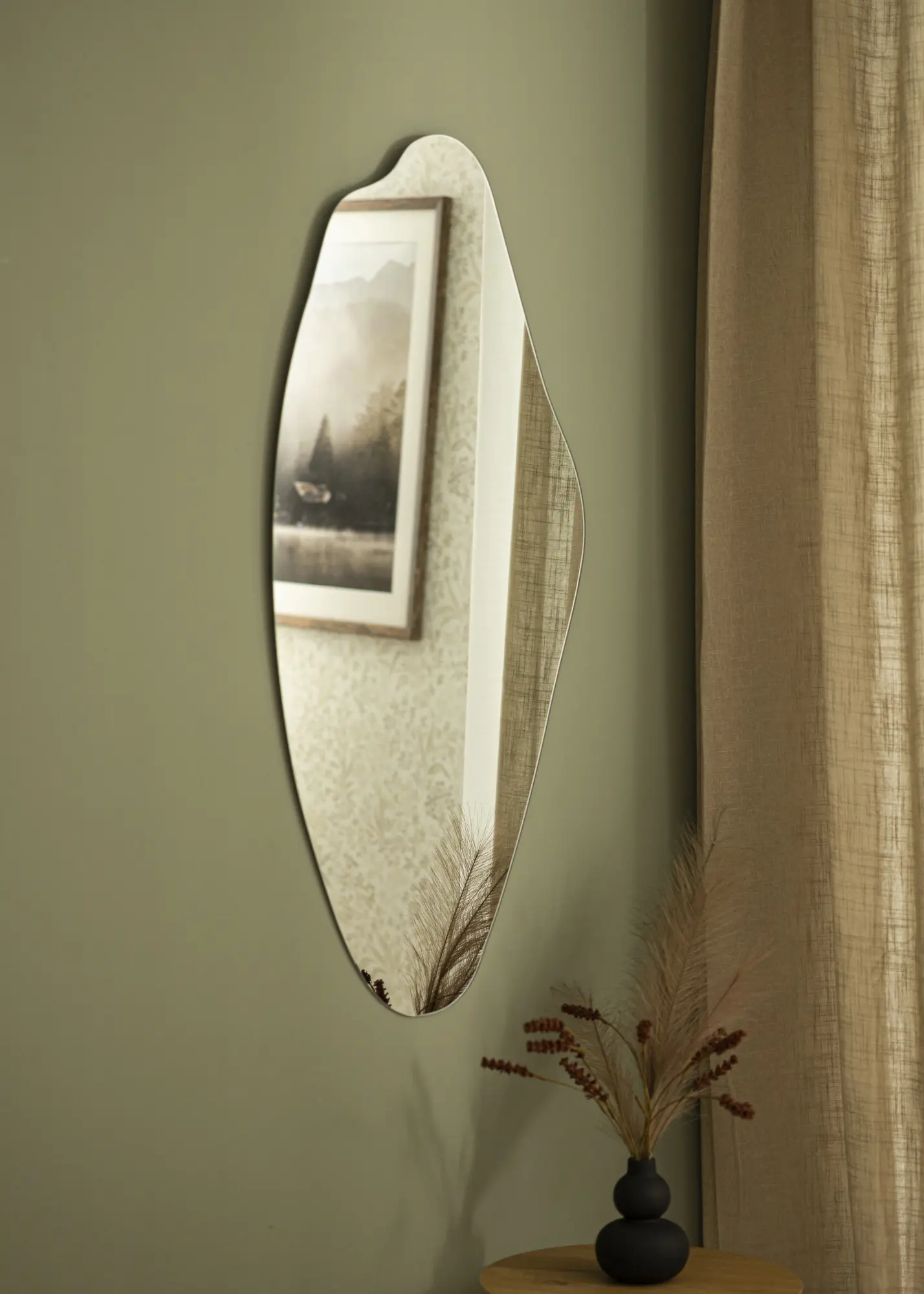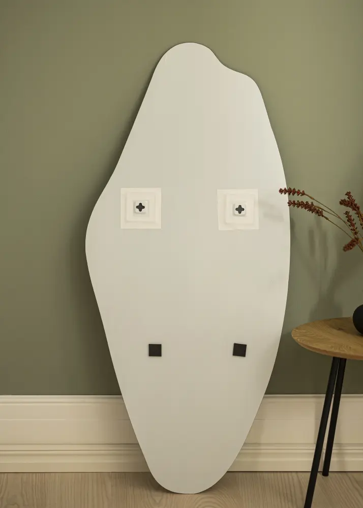 Voici un miroir de forme oblongue dans une jolie forme asymétrique, ce qui en fait un superbe détail d'intérieur convenant parfaitement aux foyers modernes. Le miroir est doté de supports muraux pratiques situés au dos et peut être accroché quel que soit le mur dans la pièce désirée – il peut aussi être utilisé dans une salle de bain !