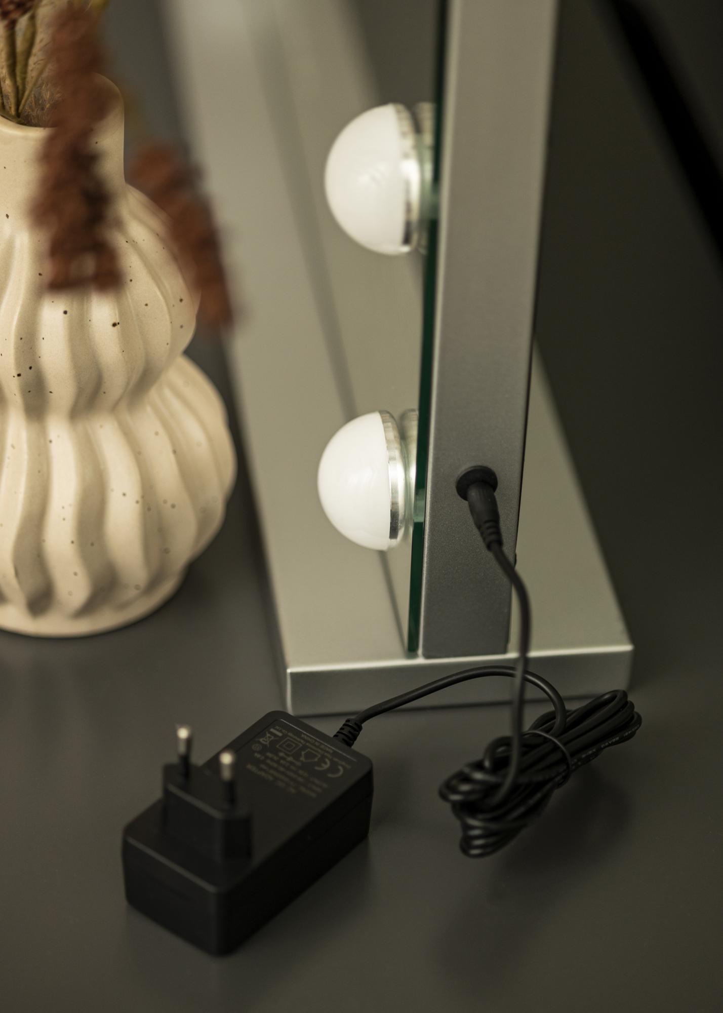 Avec ce miroir à maquillage, vous apporterez plus de glamour dans votre maison grâce à ce design luxueux pourvu de 14 grandes ampoules LED créant un bel encadrement autour de la surface réfléchissante. Son socle argenté et sa forme rectangulaire renforcent encore plus son élégante apparence. Le miroir peut être accroché au mur ou placé debout comme élément décoratif sur des commodes et des tables d'appoint. Le miroir se branche à l'aide d'une prise.