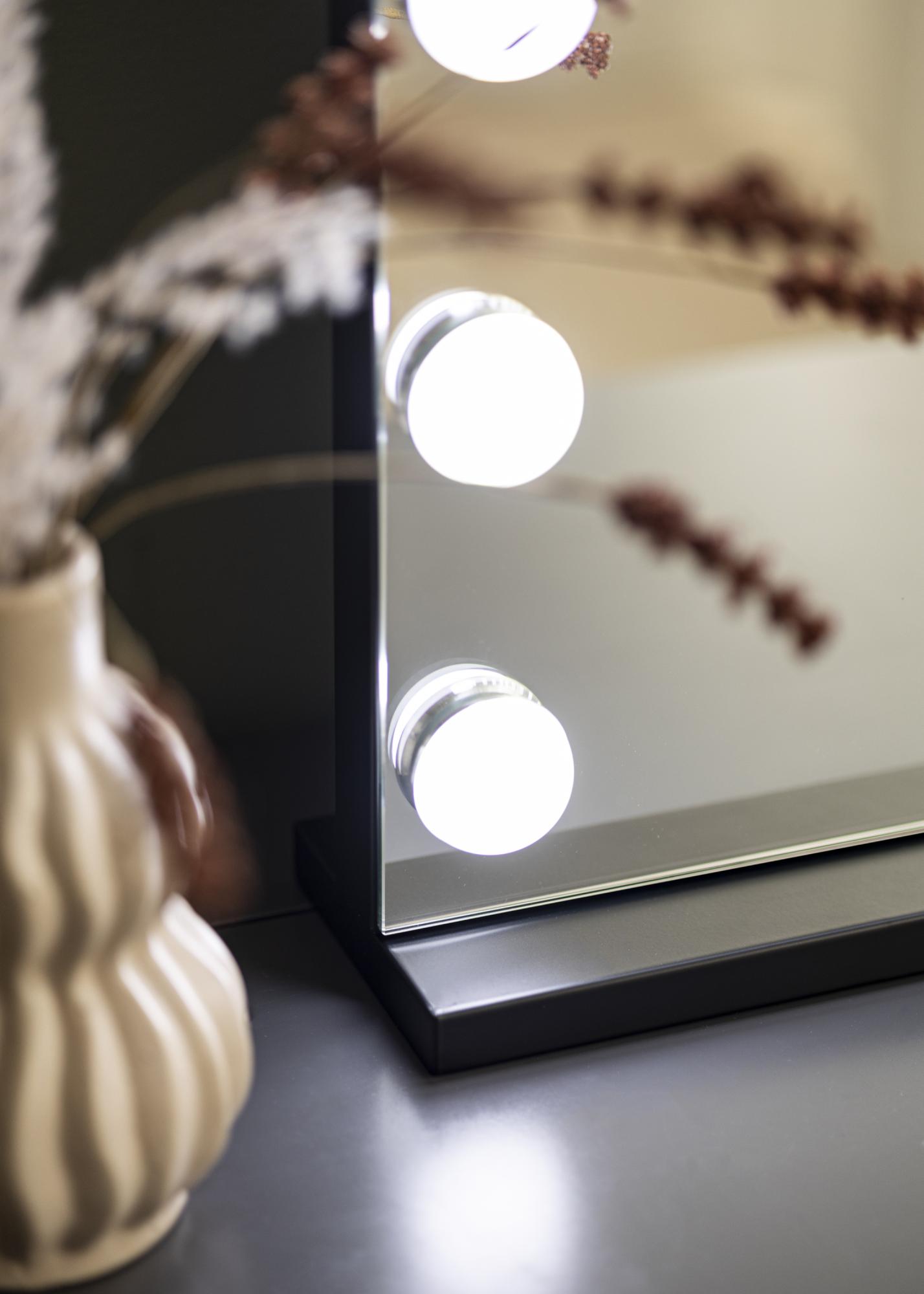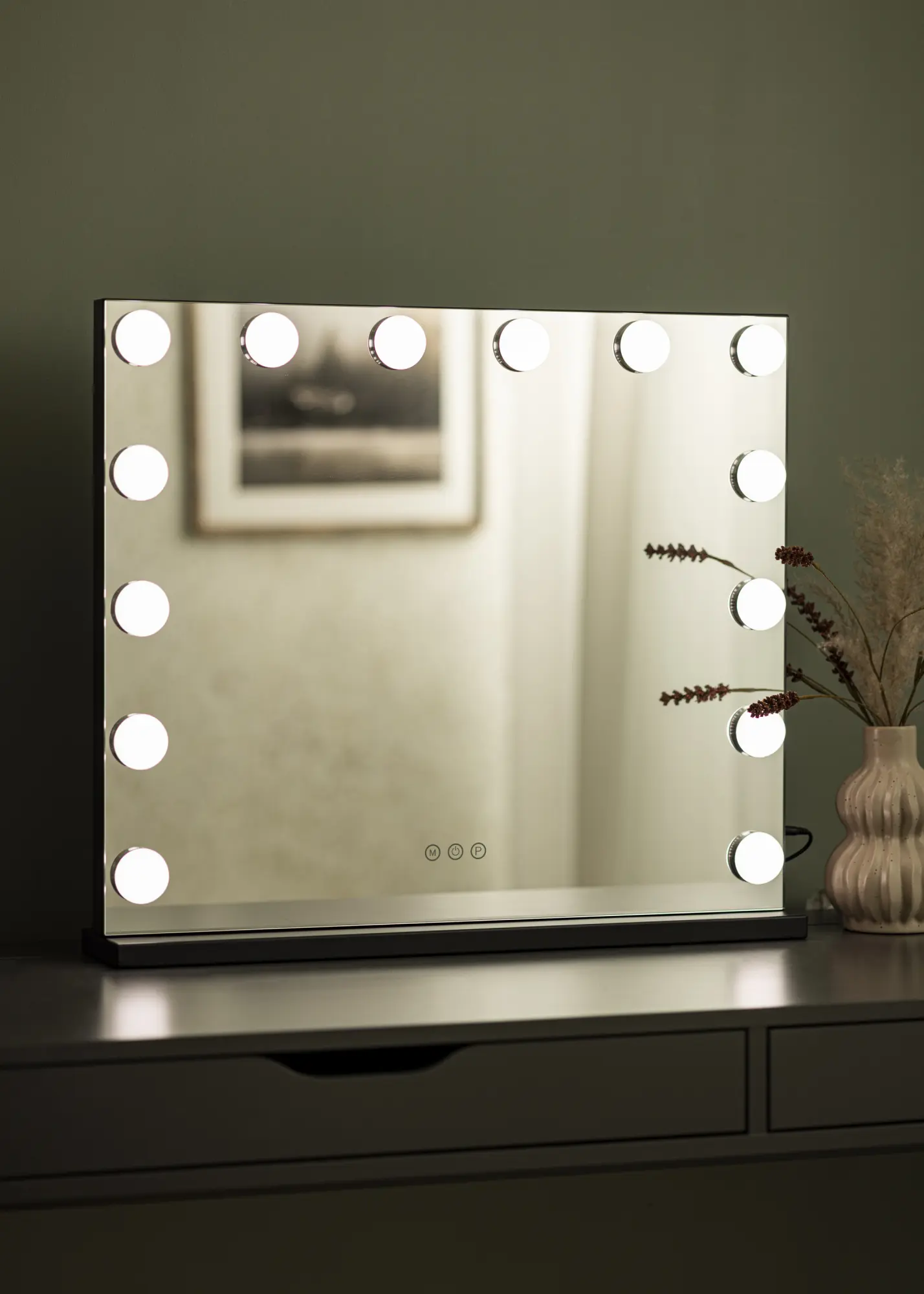 Un grand miroir à maquillage devient à la fois un détail d'intérieur élégant et un outil pratique qui vous aide à vous préparer pour la journée. Ce modèle a une grande surface réfléchissante de 65x56,5 cm, qui est encadrée par 14 LED qui émettent une lumière entre 3000K et 6000K. Le miroir a un joli design avec un éclairage distinctif et un socle noir sur lequel il peut être posé. Si vous souhaitez accrocher le miroir au mur, le socle peut être retiré.