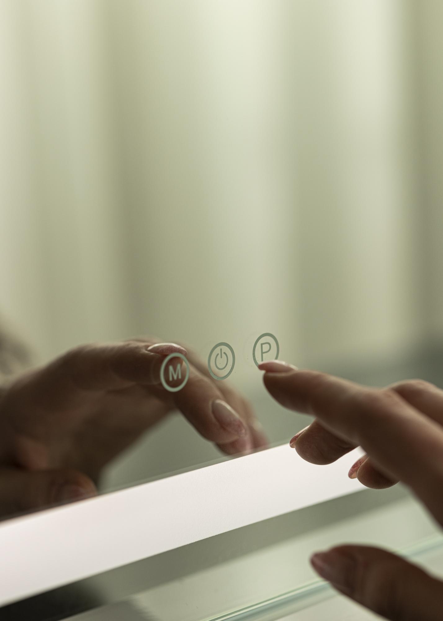 Sur le bord inférieur du miroir, se trouvent trois boutons tactiles - un pour allumer et éteindre l'éclairage et deux pour modifier les paramètres de la lumière. Le bouton "M" permet d'ajuster la température de couleur de la lumière qui peut se situer entre 3000K et 6000K ; et le bouton "P" vous permet d'atténuer la luminosité. Vous pouvez ainsi obtenir l'éclairage parfait pour chaque occasion.
