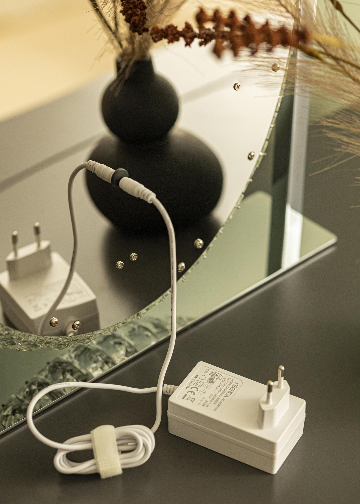 L'éclairage LED intégré fournit une lueur agréable - parfaite pour se maquiller et se préparer avant de débuter la journée. Vous pouvez également régler la lumière à l'aide des boutons tactiles situés sur le bord inférieur du miroir. Avec le bouton "M", vous pouvez modifier la température de couleur de l'éclairage et avec le bouton "P", vous pouvez atténuer la lumière à l'intensité souhaitée. Il y a aussi un bouton marche/arrêt pour allumer et éteindre l'éclairage du miroir. Le raccordement électrique se fait via une prise de courant.