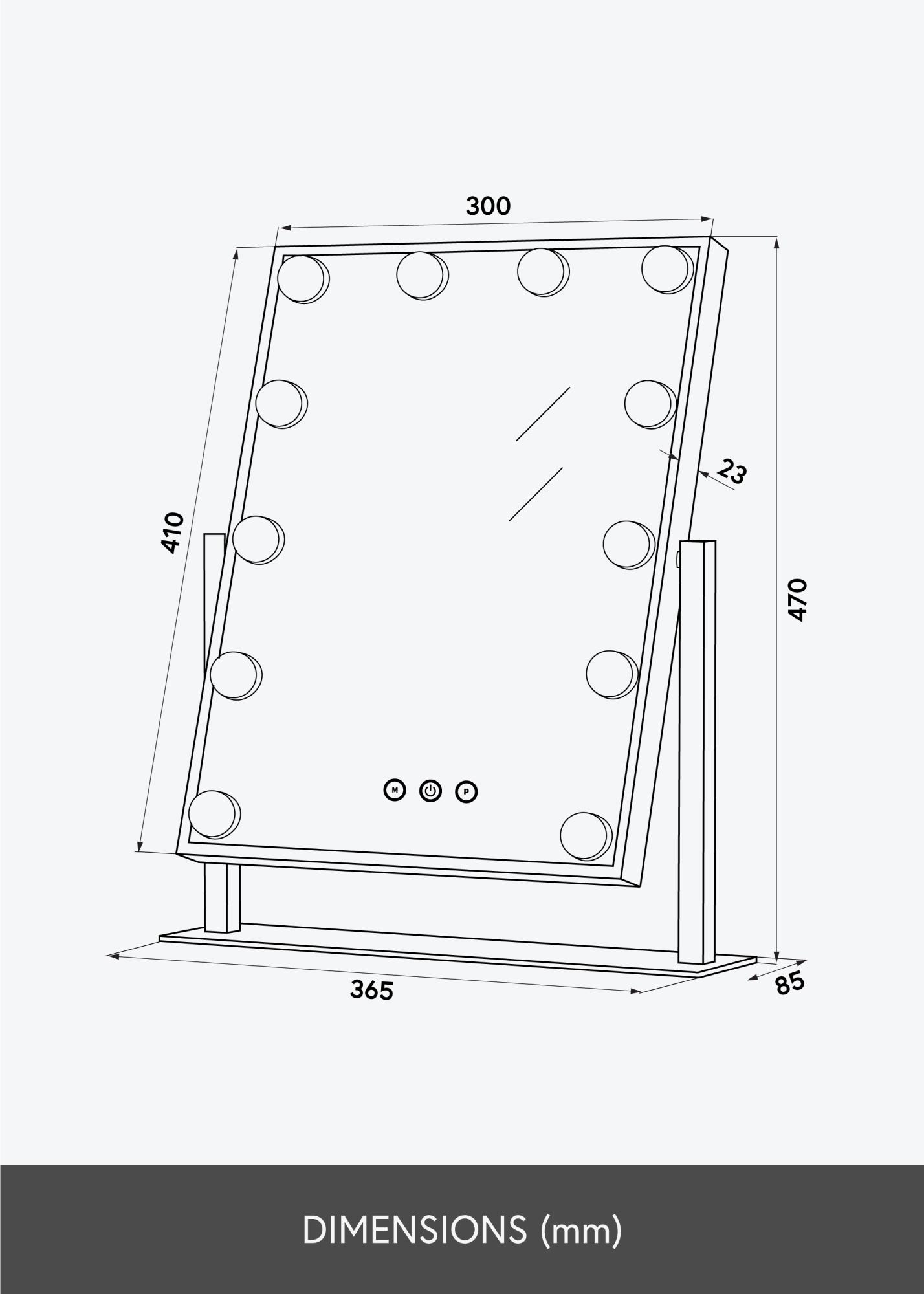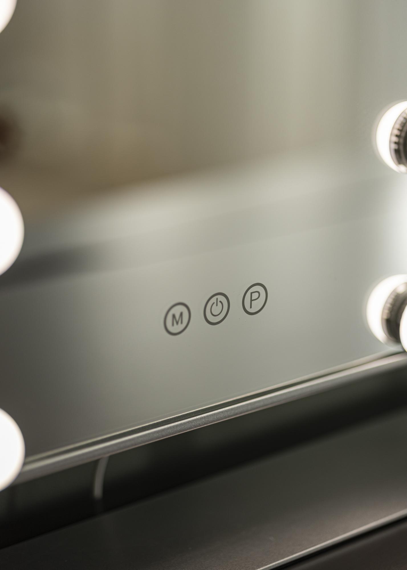 Avec ce luxueux miroir à maquillage avec éclairage intégré vous pouvez faire votre mise en beauté du jour de façon plus confortable. Le miroir de couleur argentée a en éclairage qui se présente sous la forme de 12 ampoules LED encadrant sa surface réfléchissante, ce qui donne au miroir cette apparence issue d'un mélange entre un style minimaliste et celui du glamour hollywoodien. De plus, l'éclairage du miroir peut être ajusté, et vous pouvez modifier la température de couleur et atténuer la lumière selon vos souhaits. Cela se fait à l'aide des boutons tactiles sur l'avant du miroir. Le bouton annoté d'un "M" permet de régler la température de couleur et le bouton annoté d'un "P" permet de régler la luminosité. Vous éteignez aussi l'éclairage du miroir avec un bouton tactile.