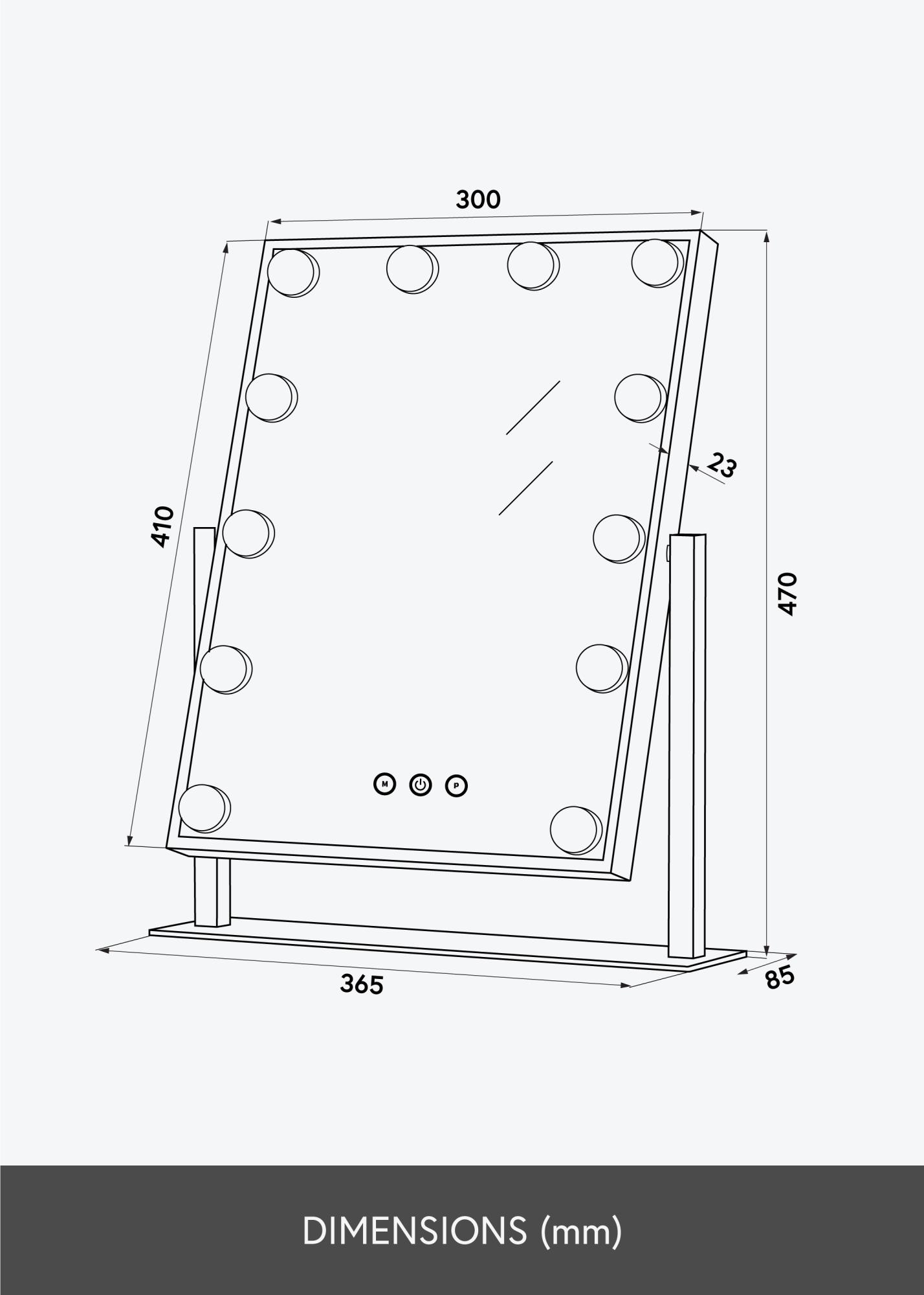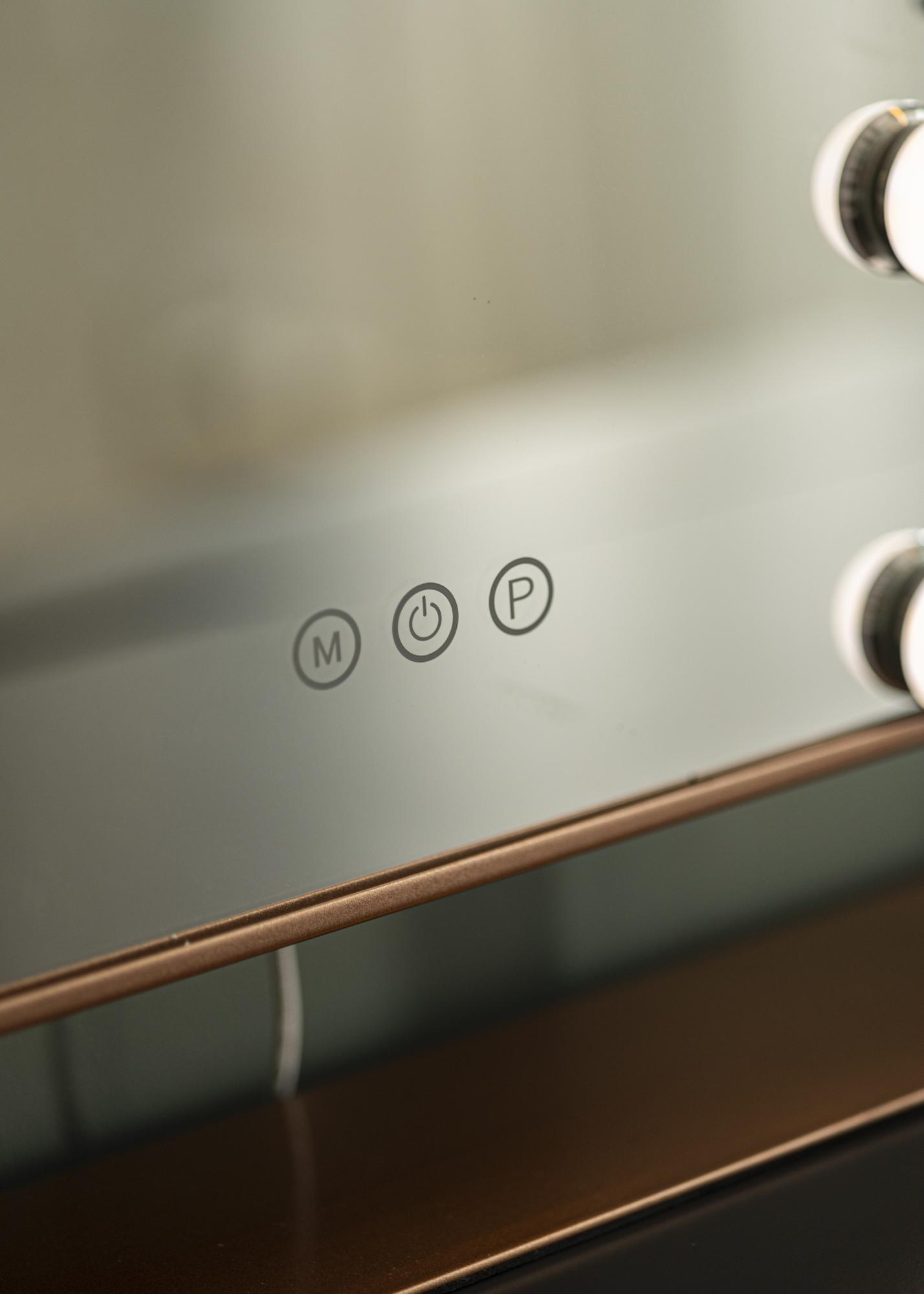 Ce miroir est doté d'un éclairage LED, sous la forme de 12 grosses ampoules qui décorent joliment la surface du miroir. Vous allumez le miroir avec un bouton tactile situé sur le miroir. Il y a même des boutons tactiles pour ajuster la puissance lumineuse et la température de couleur. Le bouton annoté d'un "M" permet de régler la température de couleur et le bouton annoté d'un "P" permet de régler la luminosité. Le raccordement électrique du miroir se fait avec une prise.