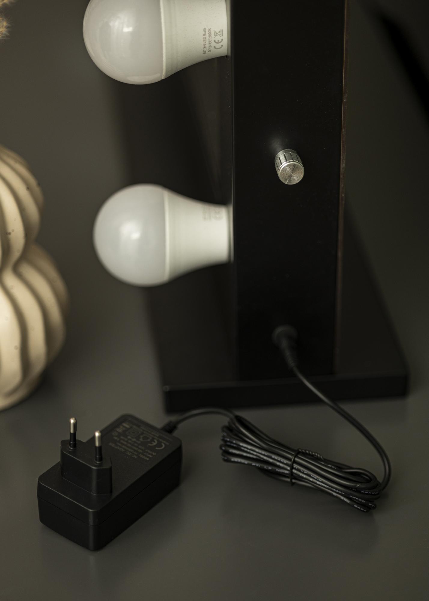 Ce miroir de maquillage présente un design élégant inspiré d'Hollywood, qui embellit votre coin maquillage ou votre salon. Le miroir dispose d’un éclairage intégré composé de 14 ampoules interchangeables, placées sur le cadre noir du miroir. Les ampoules sont interchangeables et ont une douille E27. L’éclairage diffuse une lumière blanche froide. D’un côté du miroir, vous trouverez un bouton que vous pouvez tourner pour ajuster l’intensité de la lumière selon vos préférences.