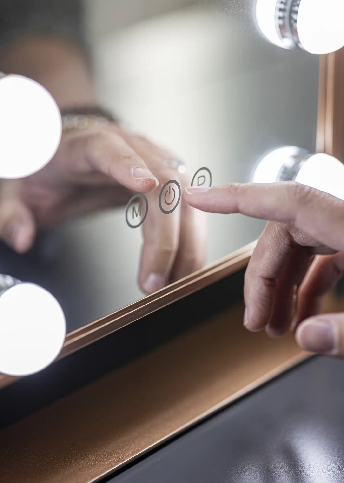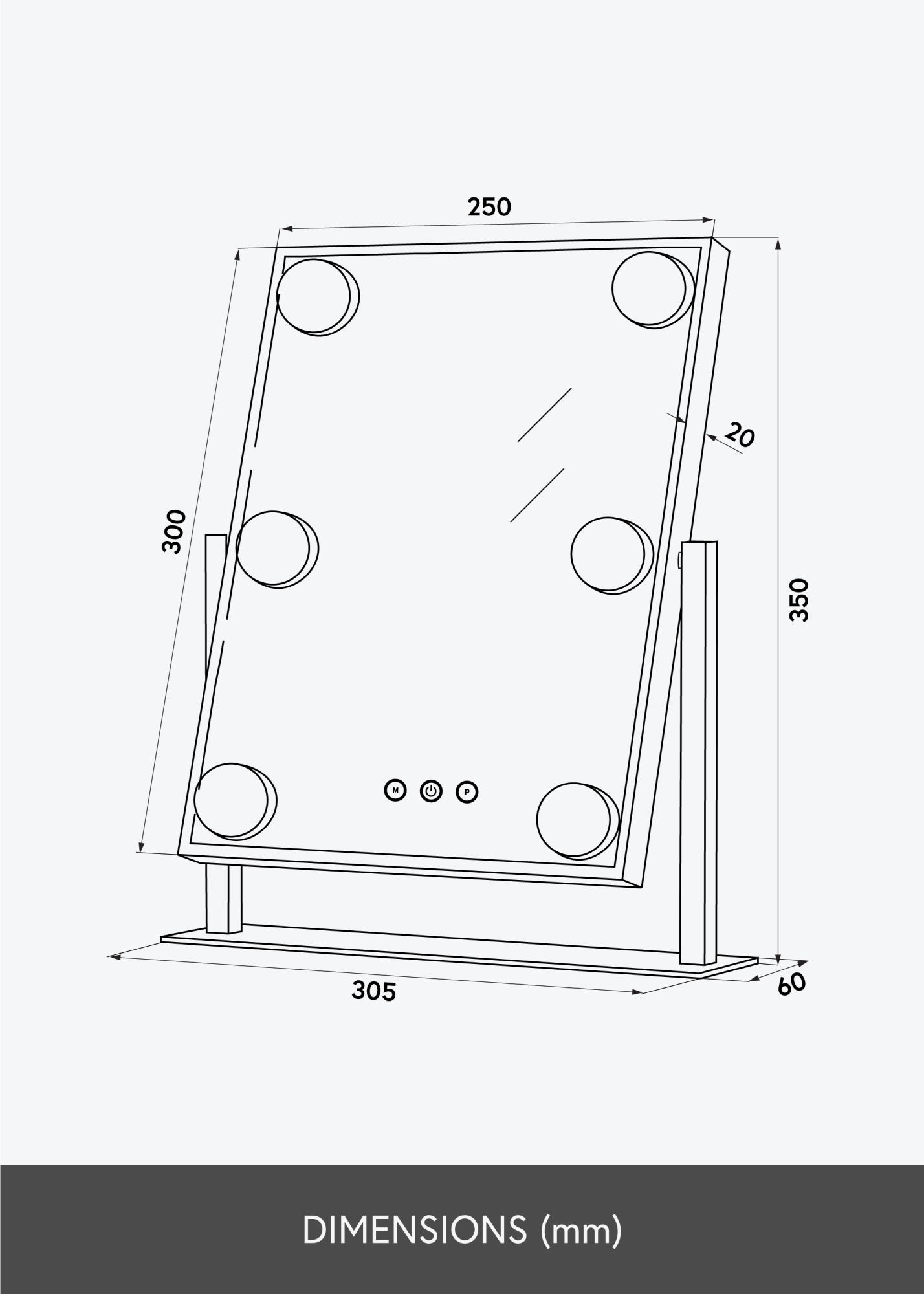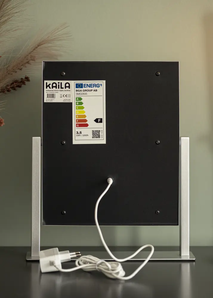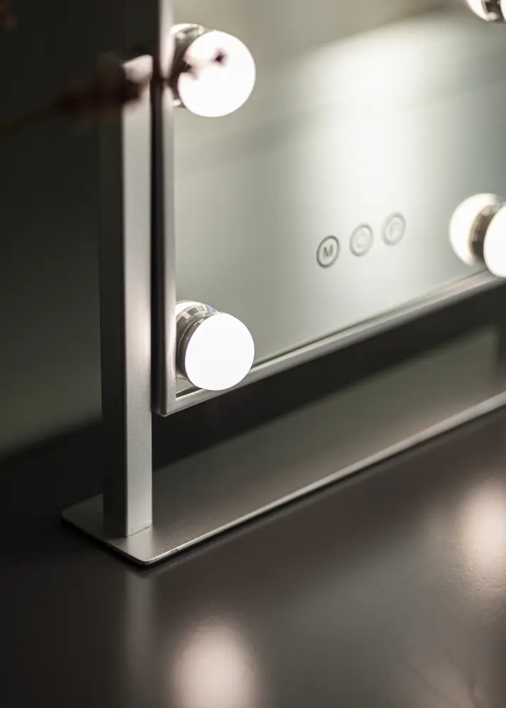 Ce miroir à maquillage par KAILA ajoutera du style et du glamour à votre intérieur ! Sa belle taille lui permet de s'intégrer tout aussi bien dans la chambre que dans le salon, selon le lieu que vous préférez pour vous maquiller et vous préparer avant de débuter la journée. Le miroir est dans une jolie couleur argent et est doté de 6 ampoules LED encadrant avec goût la surface réfléchissante du miroir. Le miroir disposent de boutons tactiles, grâce auxquels vous allumez et ajustez l'éclairage. Le bouton annoté d'un "M" permet de régler la température de couleur et le bouton annoté d'un "P" permet de régler la luminosité.