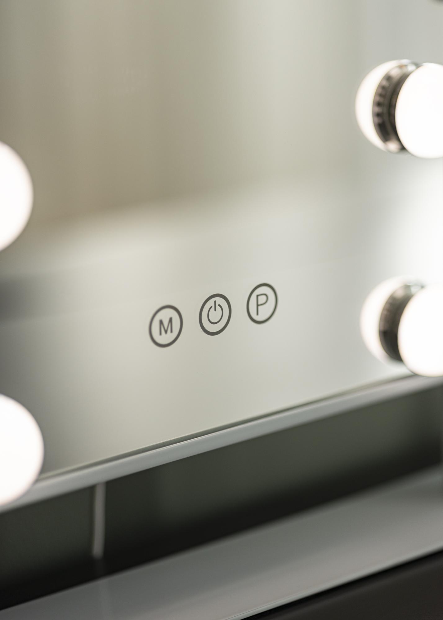 L'éclairage s'allume via un bouton tactile sur l'avant du miroir. Il y a même des boutons tactiles pour ajuster la puissance lumineuse et la température de couleur, afin que vous puissiez régler la lumière exactement selon vos souhaits. Le bouton annoté d'un "M" permet de régler la température de couleur et le bouton annoté d'un "P" permet de régler la luminosité. Le miroir se branche à l'aide d'une prise.