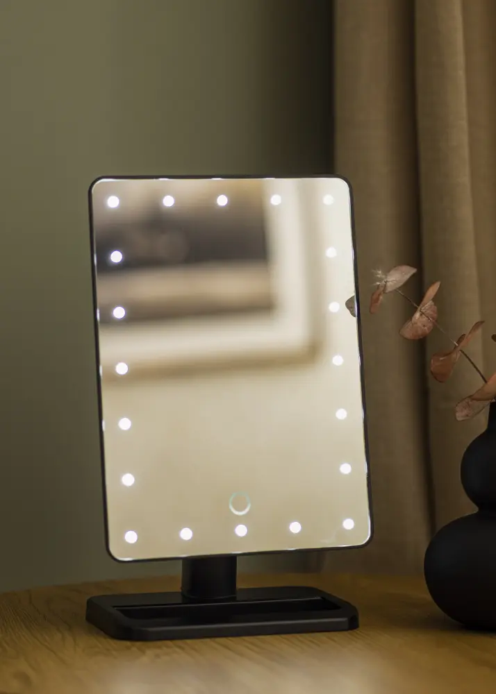 Le miroir a un design intelligent avec un éclairage LED à intensité variable qui fournit une lumière blanche froide. Vous allumez et éteignez l'éclairage avec le bouton situé à l'arrière. Afin de pouvoir vous reflétez correctement, ce miroir de maquillage est également rotatif et peut être incliné, de sorte que vous pouvez ajuster la position de la surface du miroir selon vos souhaits. Il est livré avec un miroir plus petit grossissant x2 et x3, qui peut être facilement se fixer au verre du miroir principal. Le miroir a une batterie lithium intégrée qui se recharge via une connexion USB. Câble de recharge inclus.