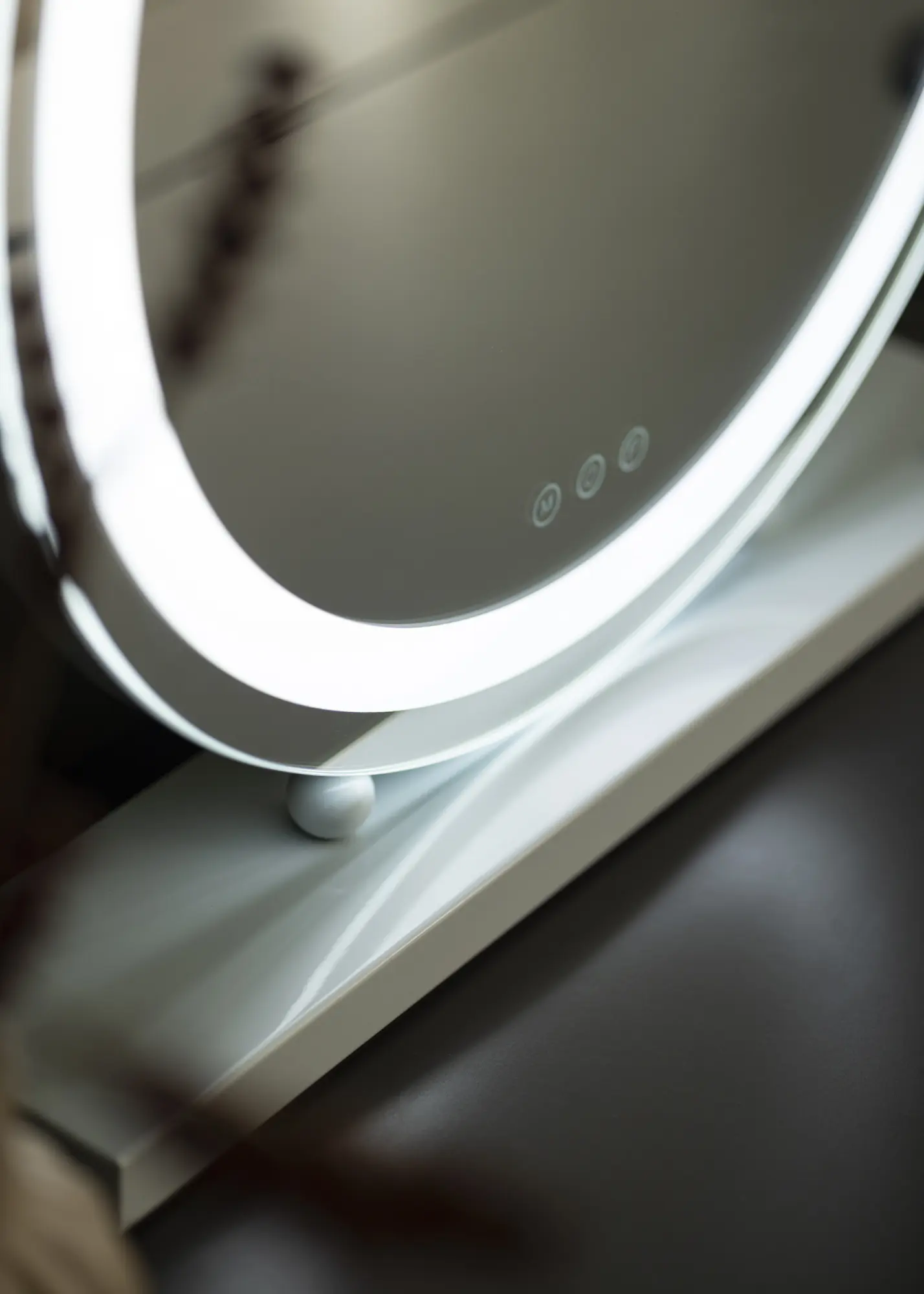 Vous désirez un miroir sophistiqué conçu pour être posé sur la coiffeuse, la commode, à mettre dans le hall d'entrée ou bien sur le buffet du salon ? Voici un miroir rond doté d'un socle épuré blanc et d'un éclairage LED intégré, qui sont à la fois des éléments élégants et pratiques pour votre maison. L'éclairage LED du miroir à maquillage se compose d'un ruban LED intégré qui s'allume et s'éteint via un bouton tactile sur la surface du miroir. Il y a aussi des boutons tactiles pour régler l'éclairage du miroir ; un bouton marqué d'un "M" pour le réglage de la température de couleur et un bouton marqué d'un "P" pour la puissance de la luminosité.
