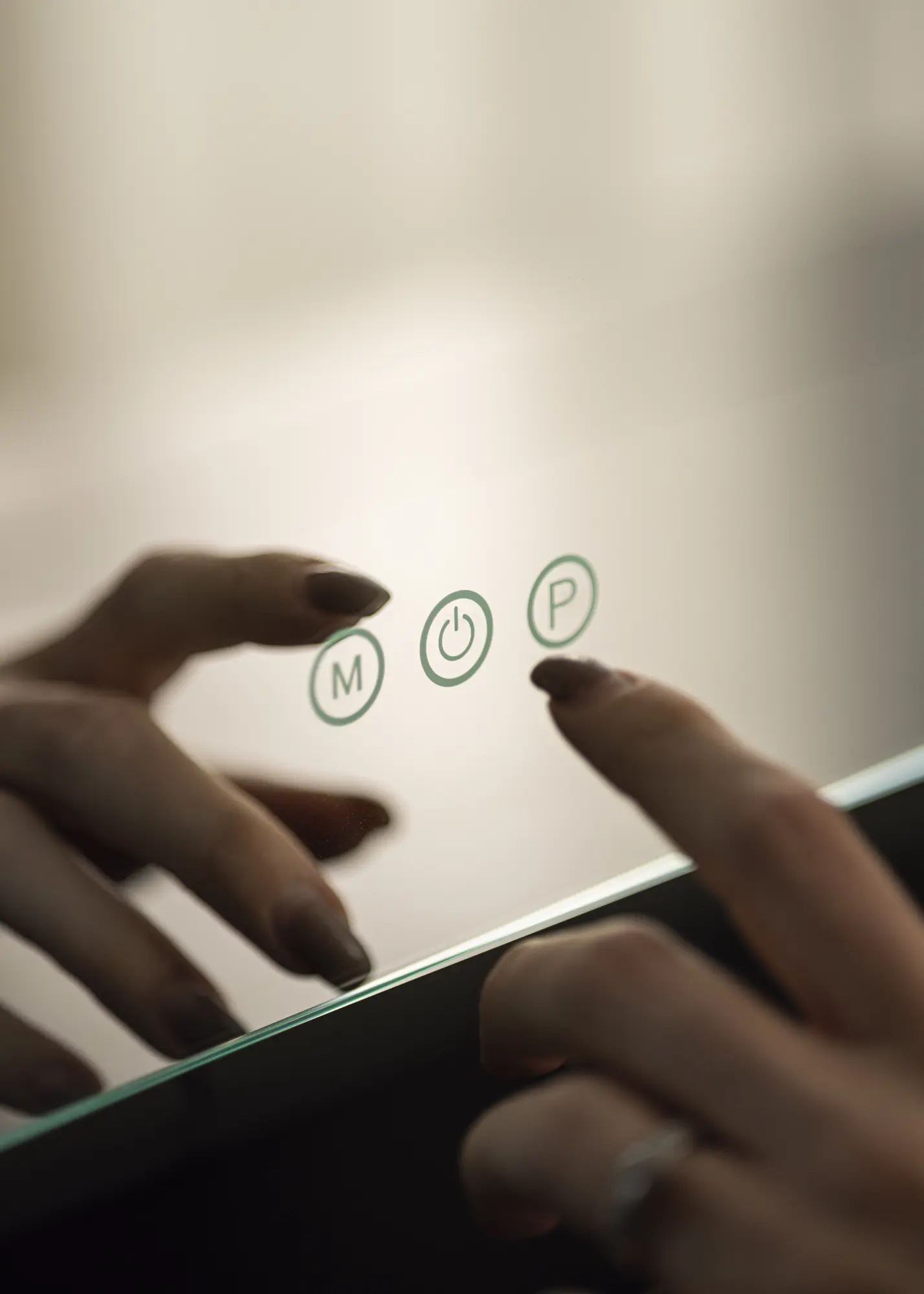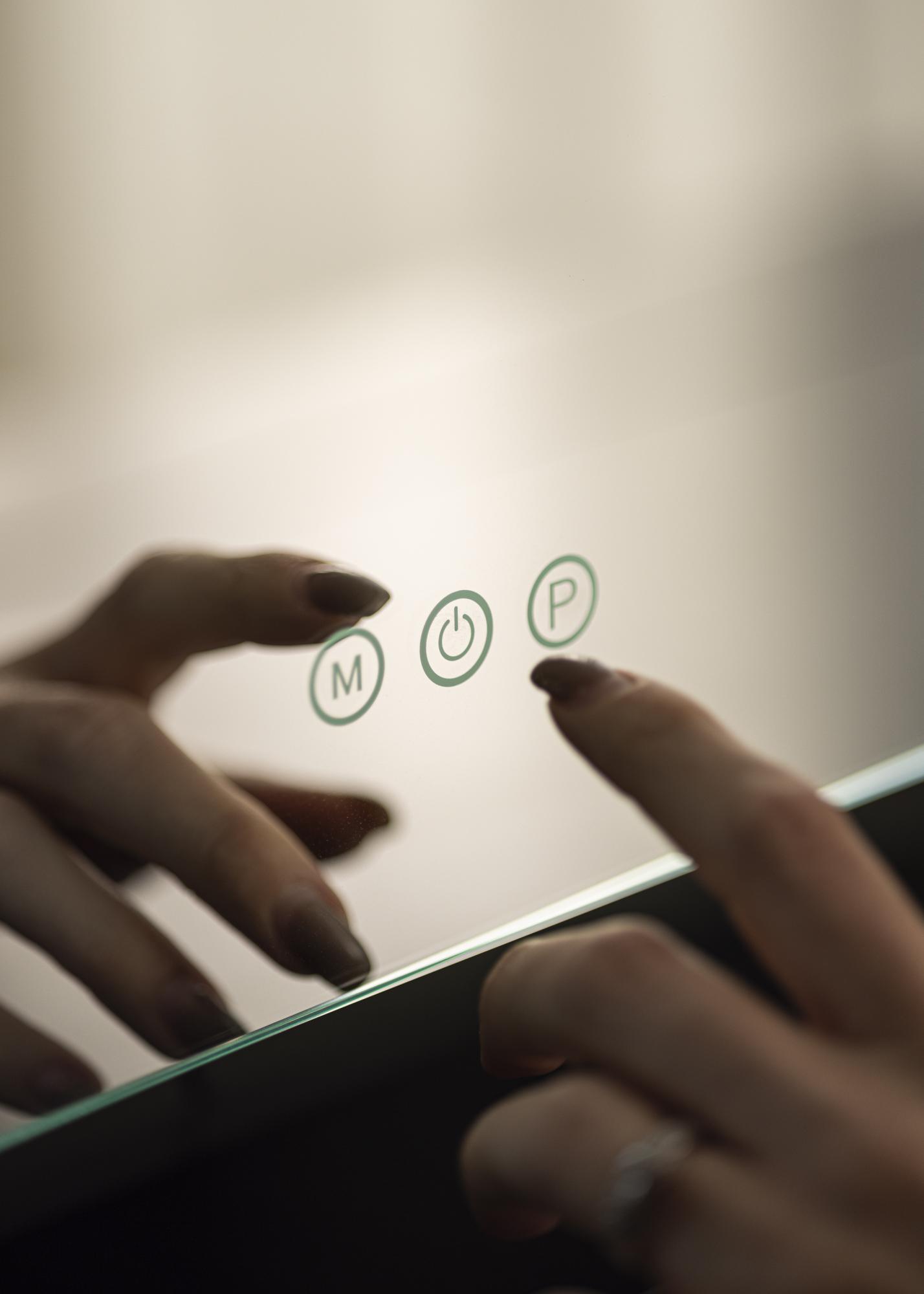 Un miroir raffiné doté d'un éclairage deviendra à la fois un détail d'intérieur tendance et un ajout pratique et idéal lorsque vous vous maquillez le matin. Voici un modèle conçu en métal dans un design sophistiqué avec une teinte or rosé et doté d'un ruban LED intégré qui encadre la surface réfléchissante. Vous pouvez allumer et éteindre l'éclairage quand vous le souhaitez et régler la lumière selon vos goûts et vos envies - le tout à l'aide des boutons tactiles situés sur le bord inférieur du miroir. Il s'y trouve un interrupteur classique marche/arrêt ainsi qu'un bouton pour régler la puissance lumineuse (marqué d'un "P") et un bouton pour régler la température de couleur de la lumière (marqué d'un "M"). Vous pouvez ainsi choisir entre une lumière chaude, froide ou naturelle.