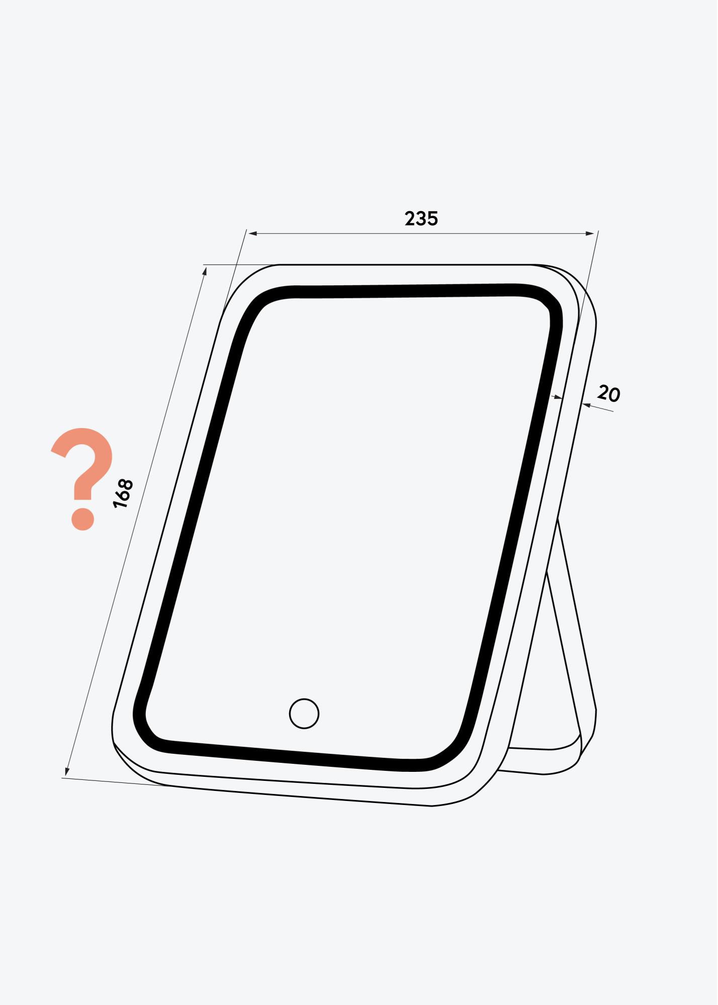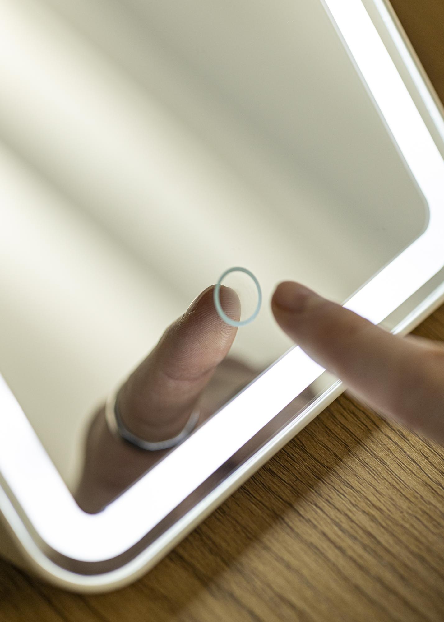 Voici un miroir à maquillage dans un petit format, ce qui est idéal pour ceux d'entre vous qui aiment avoir un miroir sur eux lors des déplacements. Sa surface réfléchissante fait 16,5x23 cm et est encadrée d'un élégant ruban LED. Pour votre confort, vous pouvez facilement atténuer la lumière ou bien changer la température de couleur de l'éclairage. Cela se fait en appuyant pendant quelques secondes sur un bouton tactile situé sur le bord inférieur du miroir.