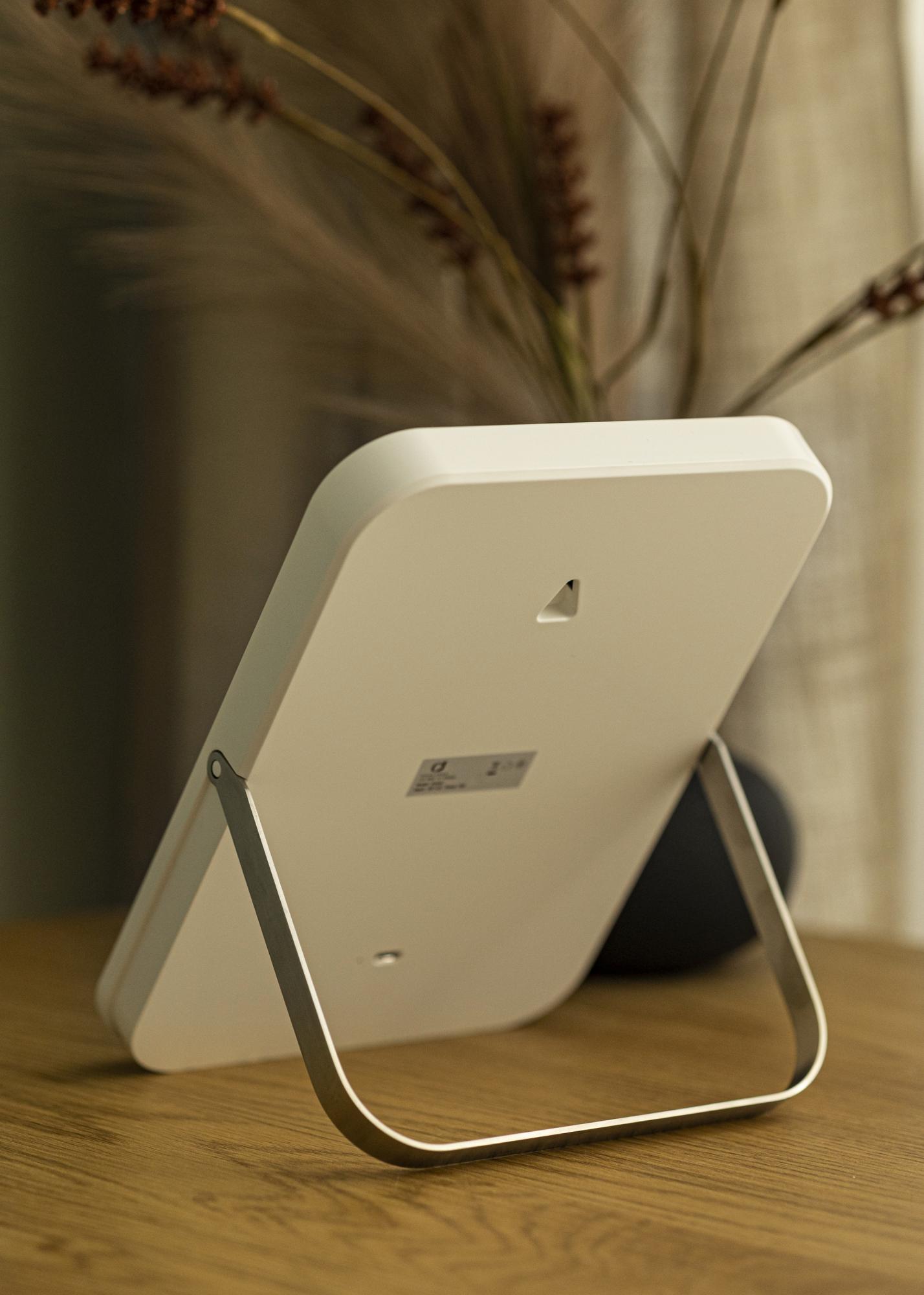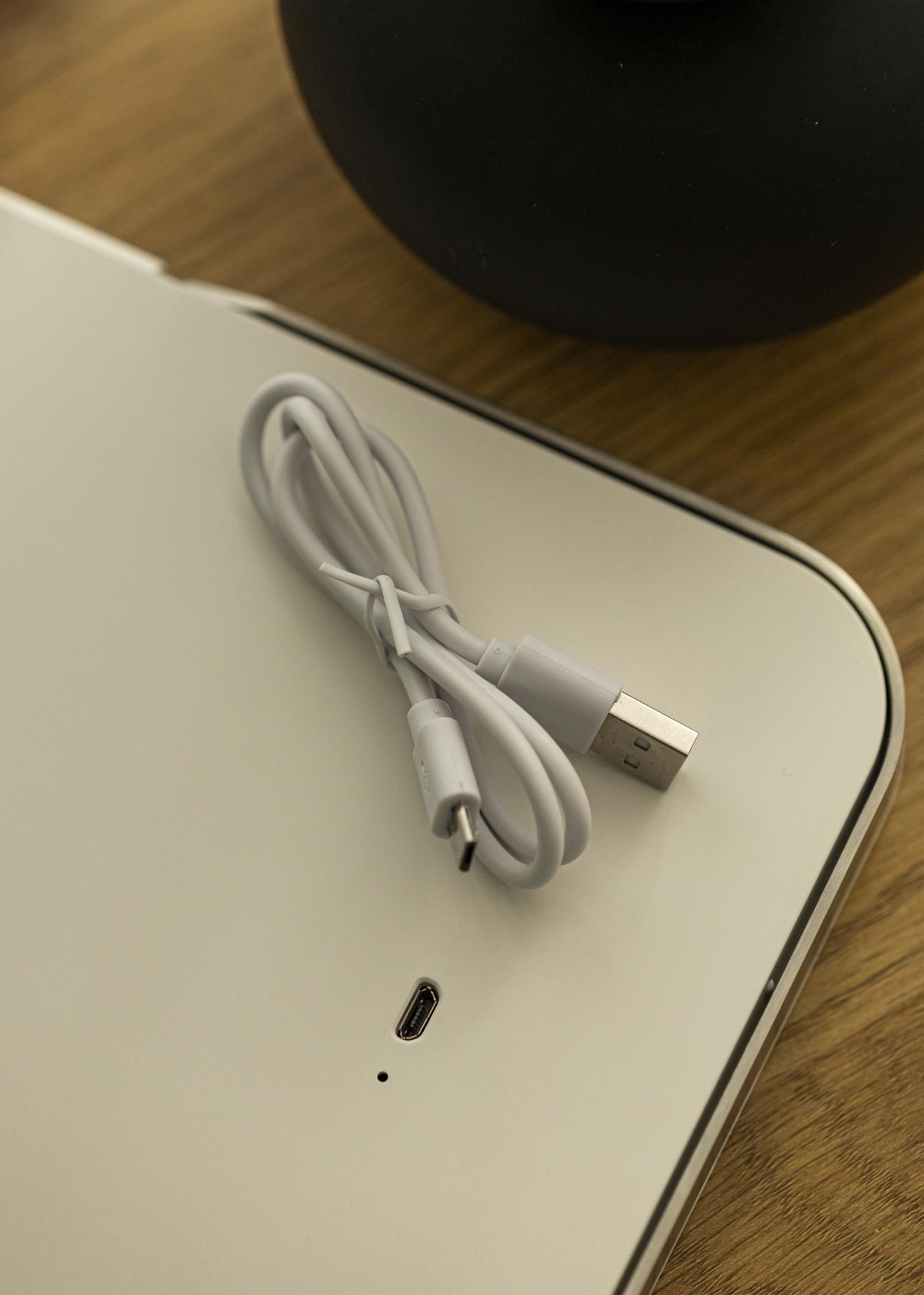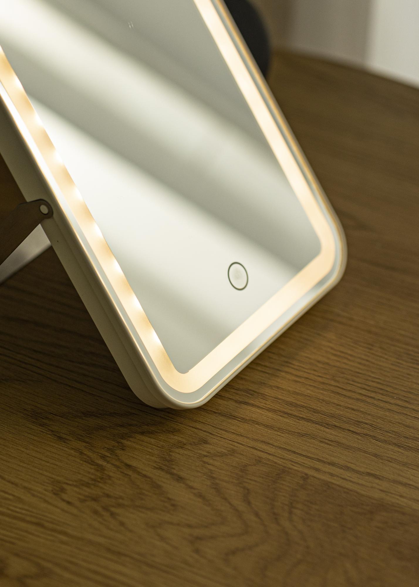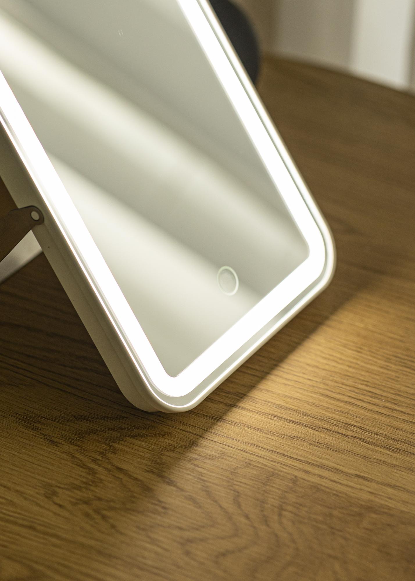 Ce miroir à maquillage est dans une couleur blanche neutre, et un socle argenté qui peut être replié. Le miroir a une batterie incrusté qui se recharge facilement à l'aide d'un port USB. Le câble de rechargement est inclus.