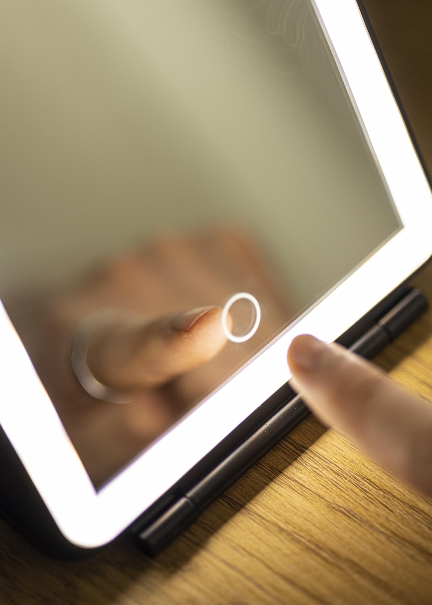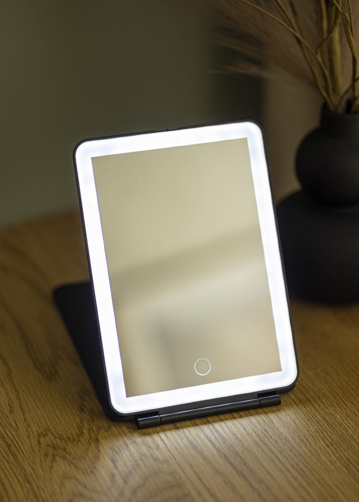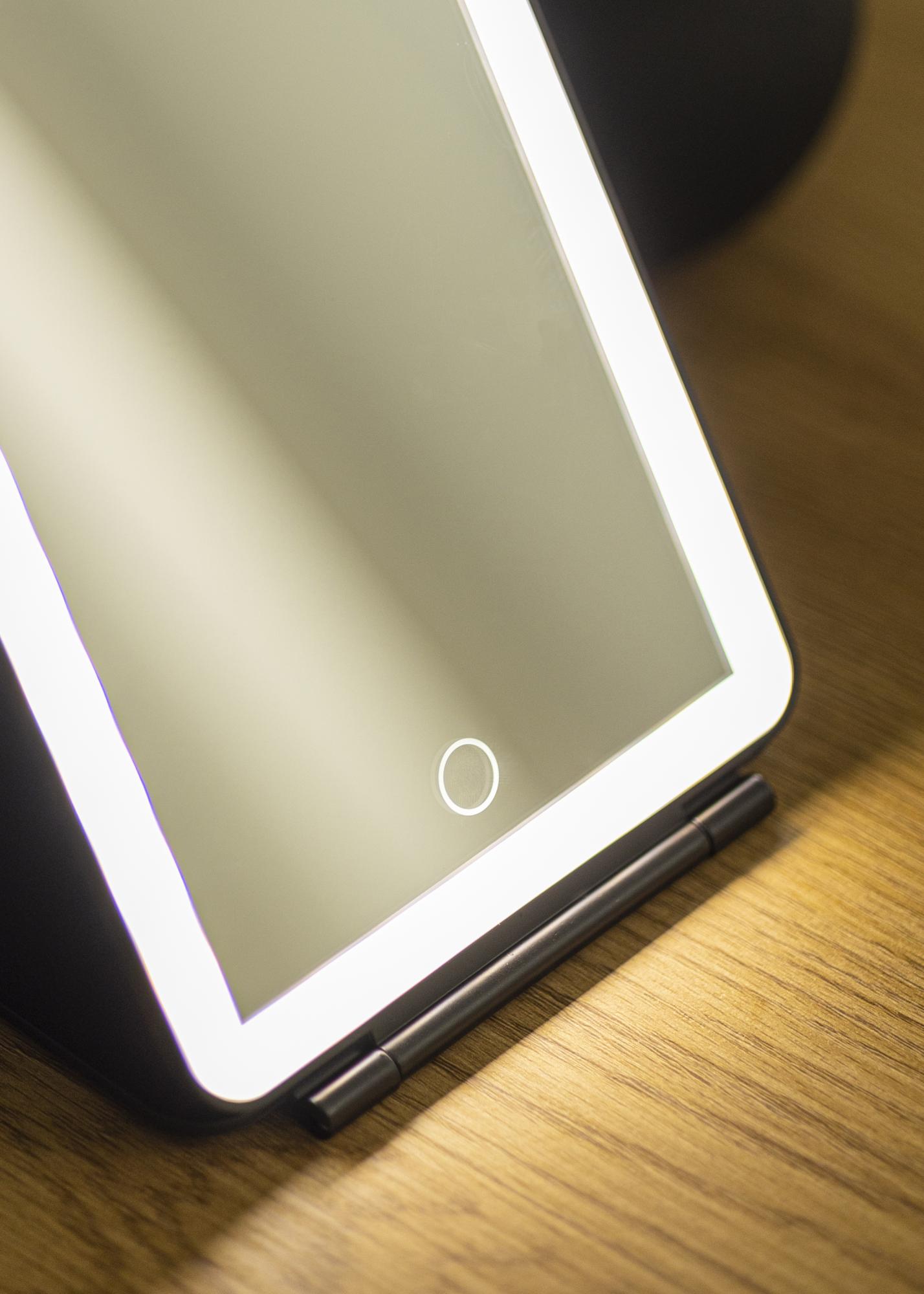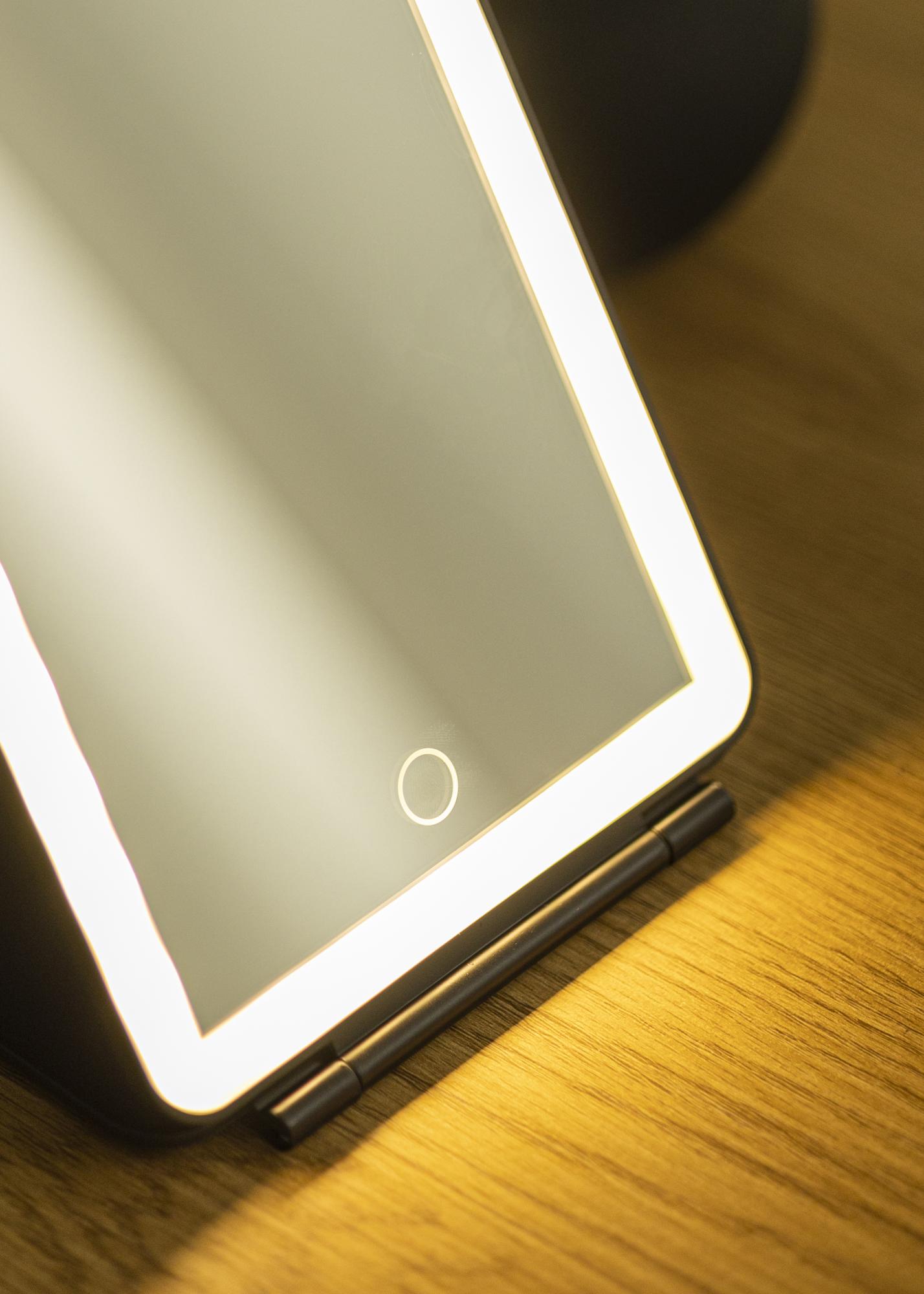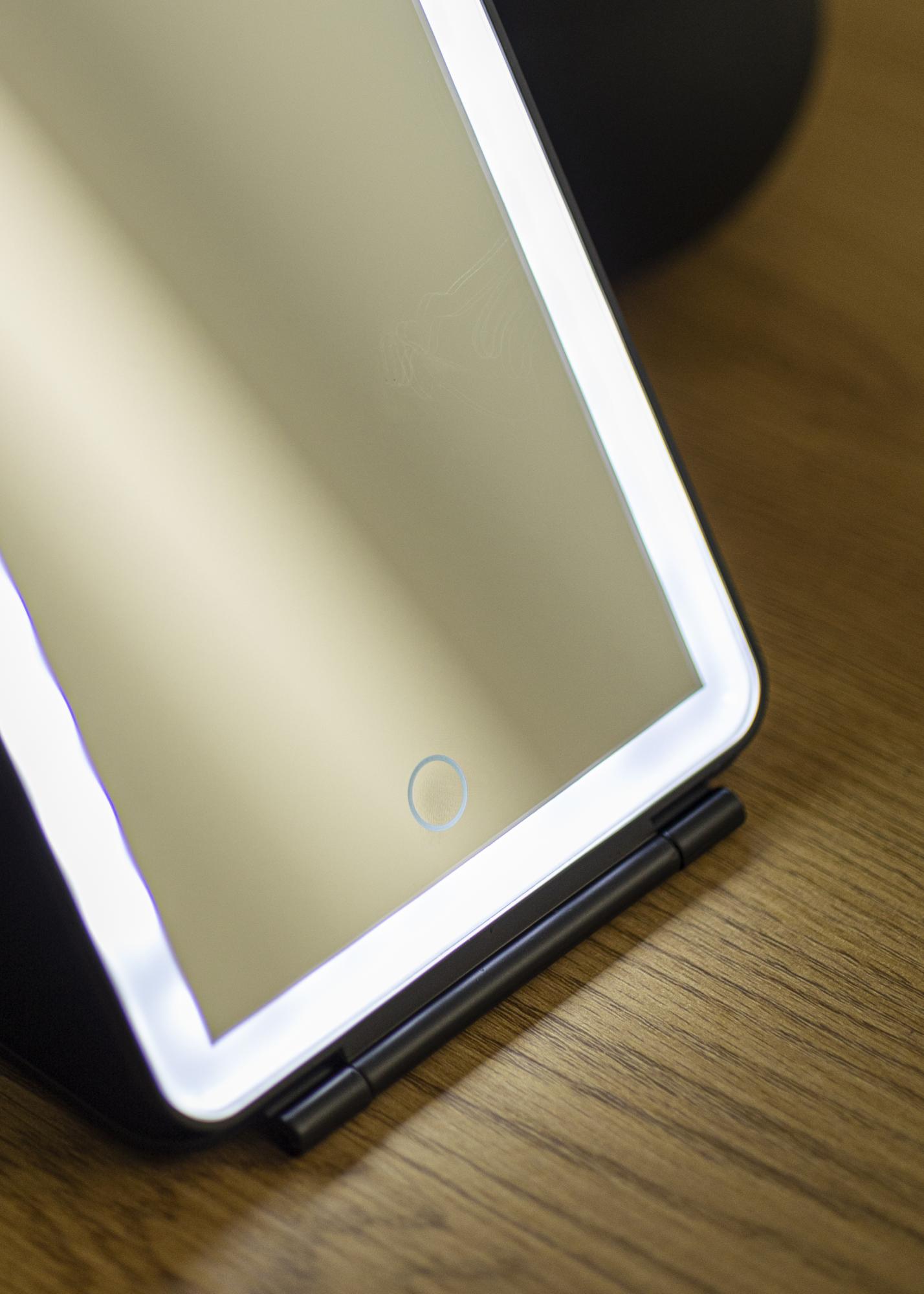Ce miroir se présente dans une couleur noire élégante et il peut également être replié, ce qui permet à la fois de gagner de la place et de protéger la surface du miroir des rayures lorsque vous rangez le miroir dans votre sac. Lorsqu'il est ouvert, vous pouvez incliner le miroir. Sur sa surface réfléchissante se trouve un bouton tactile qui permet d'allumer et d’éteindre l'éclairage du miroir. Si vous maintenez le bouton enfoncé pendant quelques secondes, vous pouvez également modifier les paramètres d'éclairage.