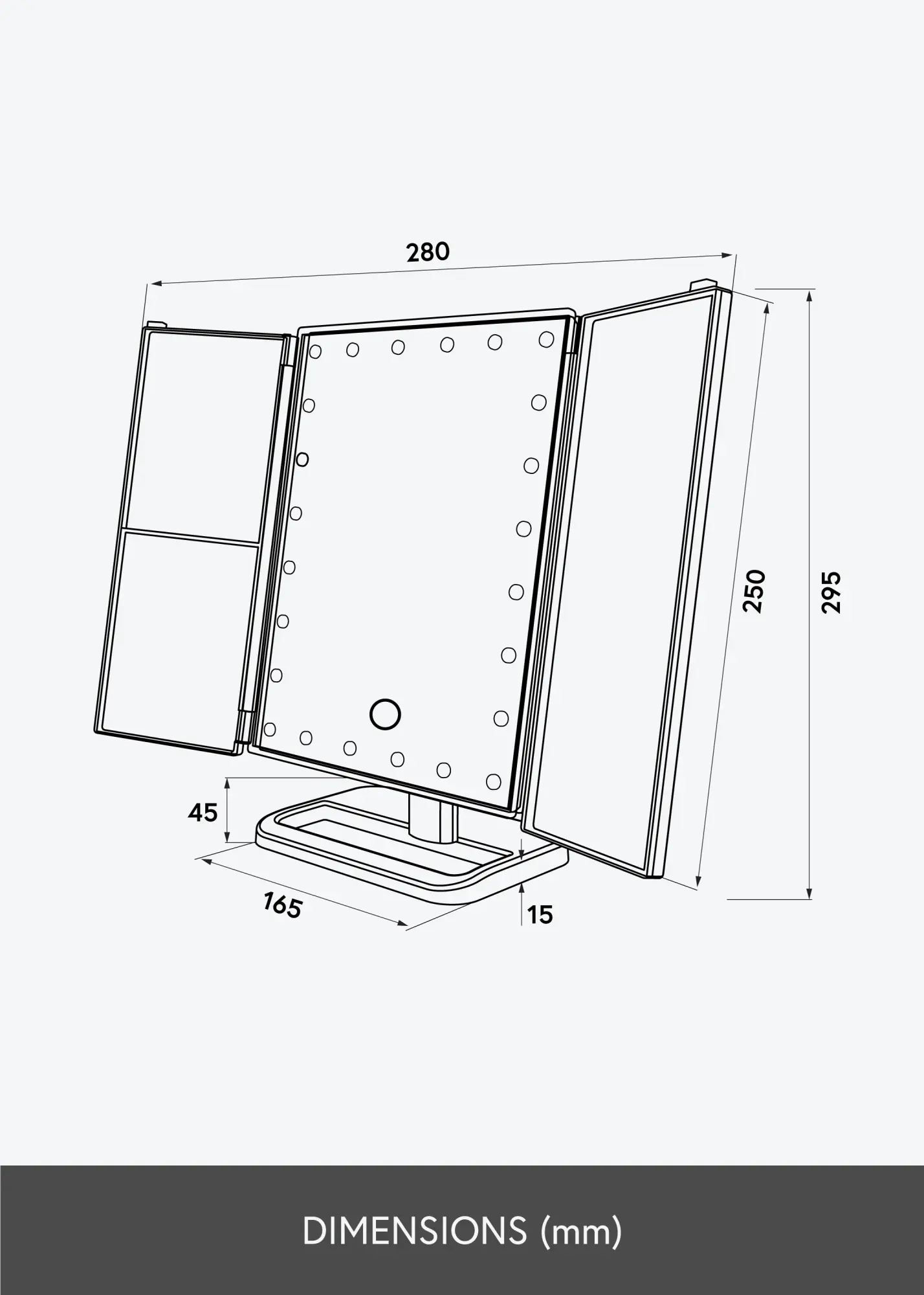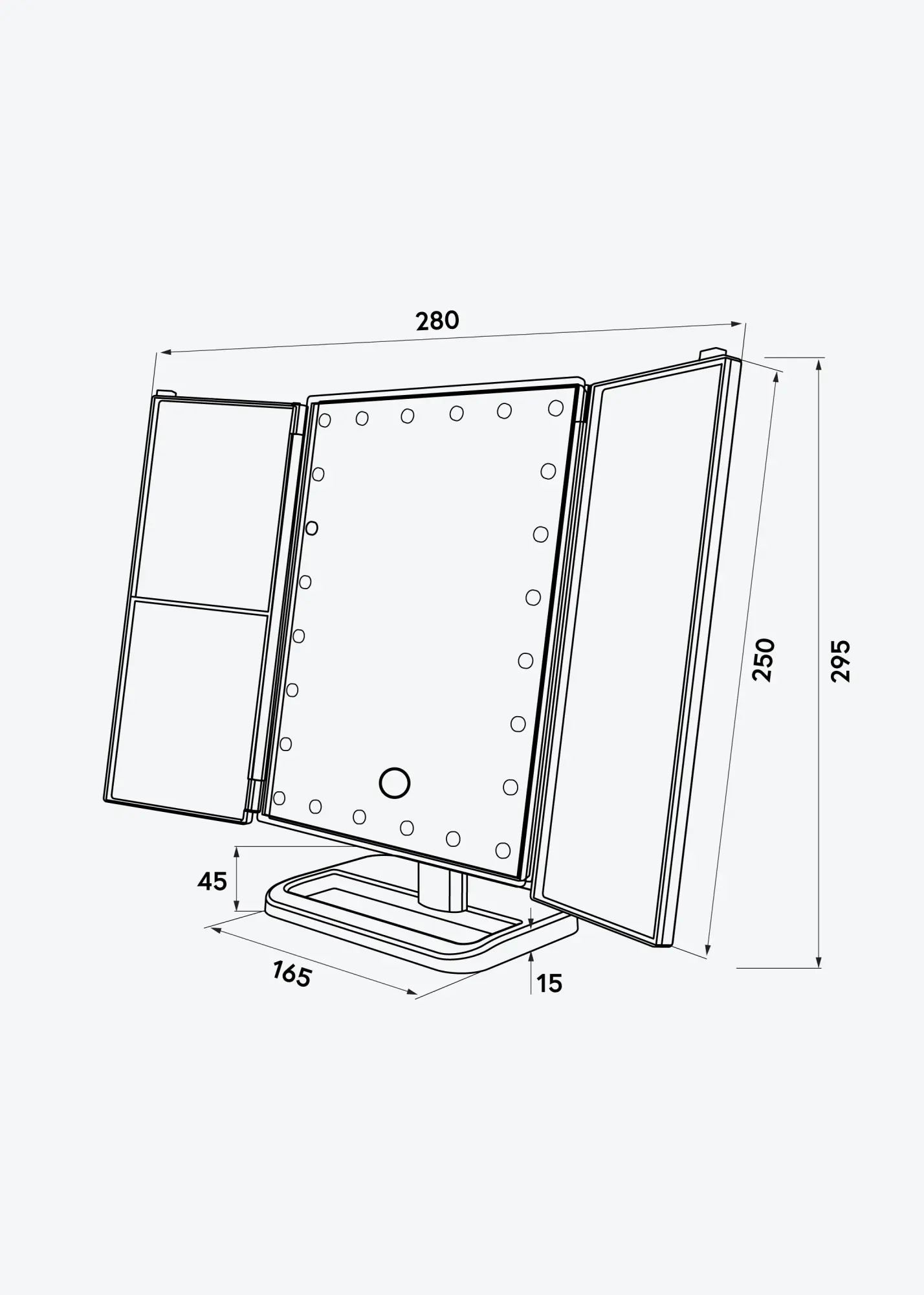 Le miroir est conçu intelligemment avec des panneaux latéraux qui peuvent se rabattre. De cette façon, vous pouvez facilement incliner le miroir, ce qui facilite l'application du maquillage, par exemple. La surface miroir principale est équipée d'un verre miroir normal, et les petits miroirs sur les côtés procurent un effet grossissant en x2, x3 et x10. Très pratique quand on veut pouvoir se concentrer sur une partie du visage en détail.