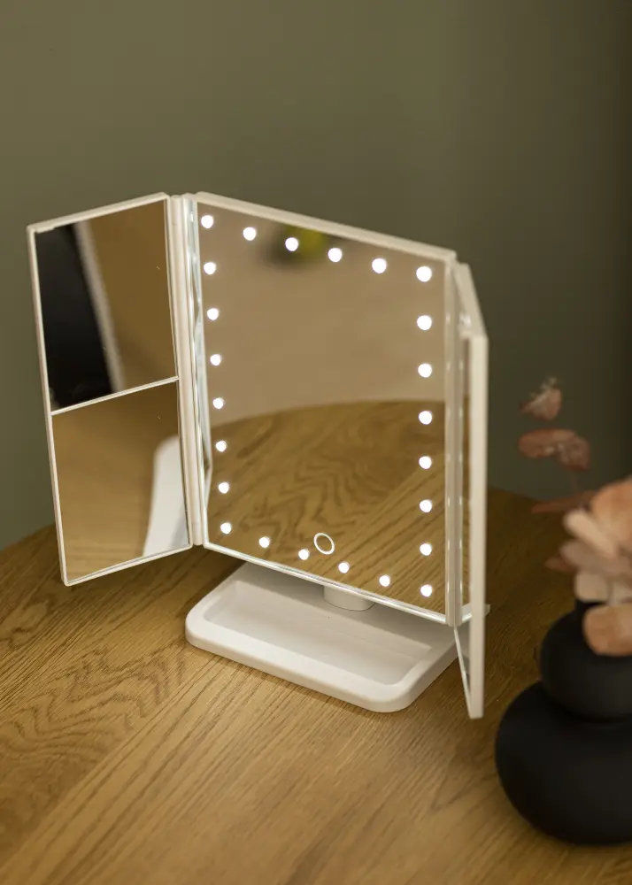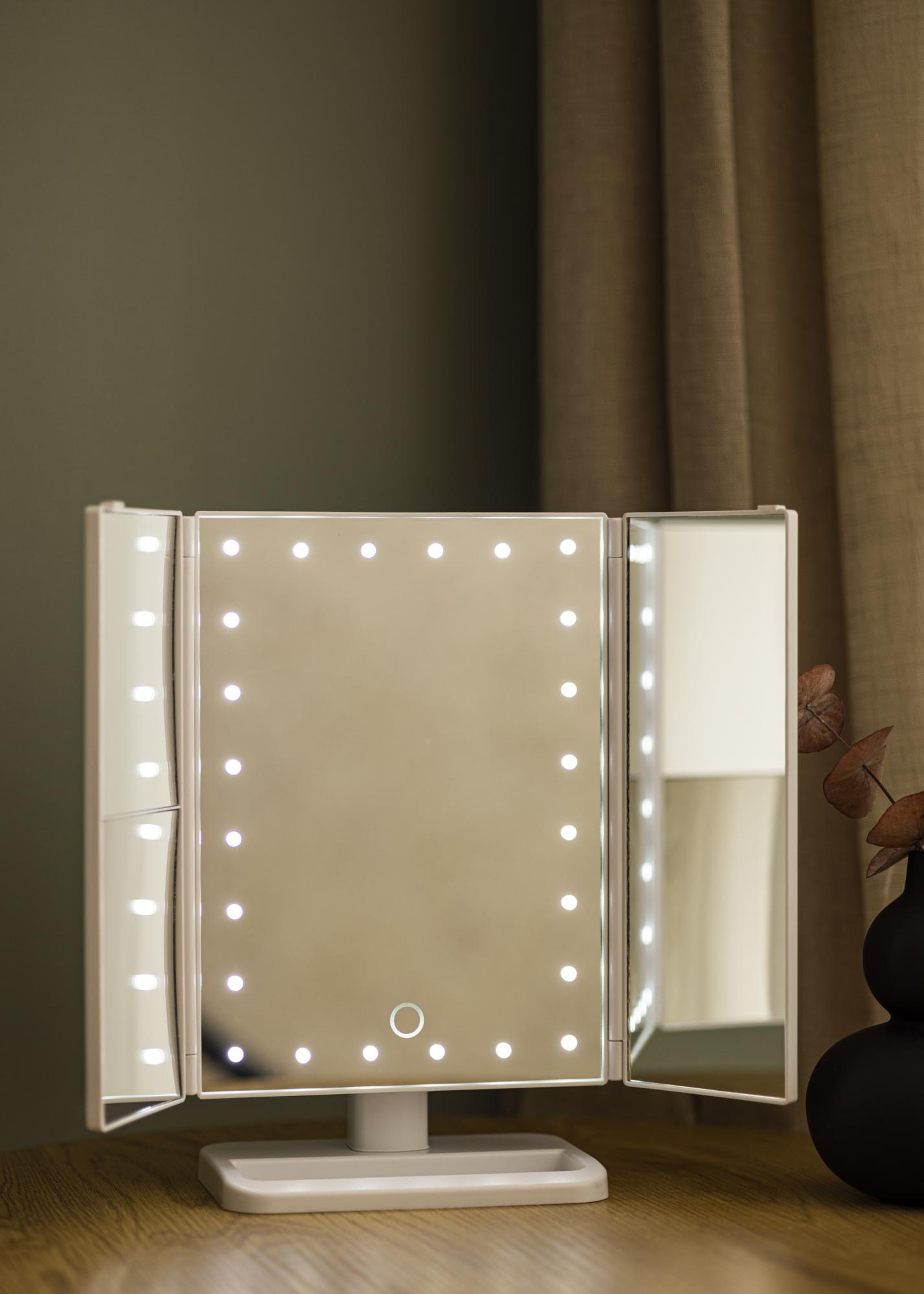 Voici un miroir de maquillage transportable avec des fonctionnalités astucieuses qui vous offrent de nombreuses possibilités d'utilisation. Il est aussi très joli en guise d'élément de décoration ! Le miroir dispose de quatre surfaces réfléchissantes et d'un éclairage LED encadrant la surface centrale du miroir. Si vous maintenez enfoncé le bouton tactile situé sur la face avant du miroir pendant quelques secondes, vous pouvez atténuer l'éclairage. Le miroir de maquillage peut se connecter au le câble USB inclus. Si vous souhaitez utiliser votre miroir lors de vos déplacements, il peut également être alimenté par des piles AA, celles-ci ne sont pas incluses.