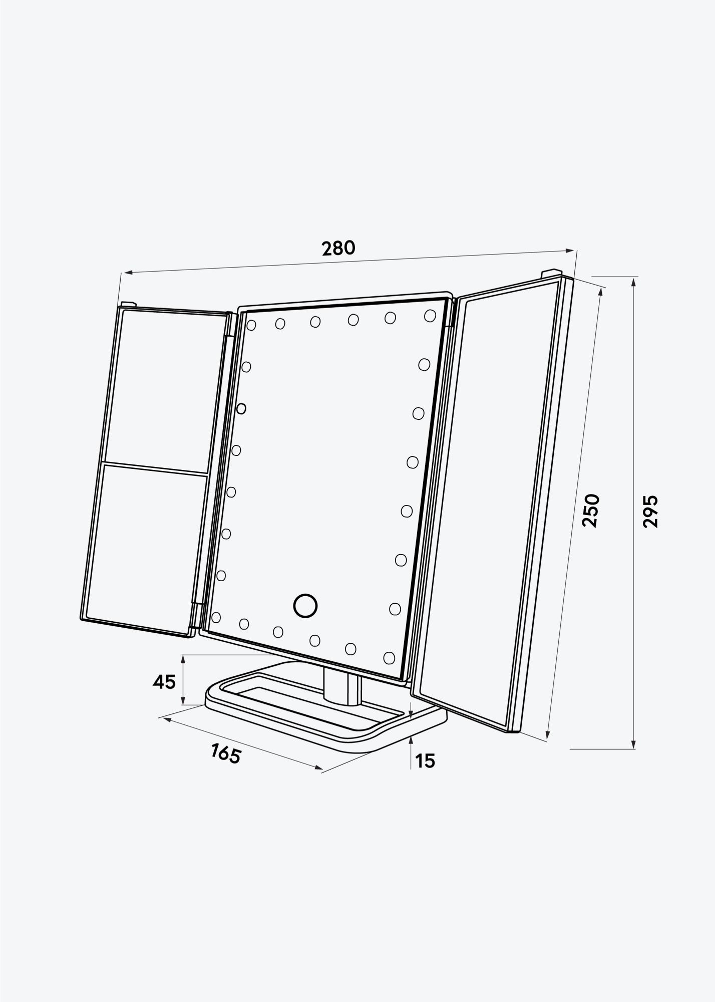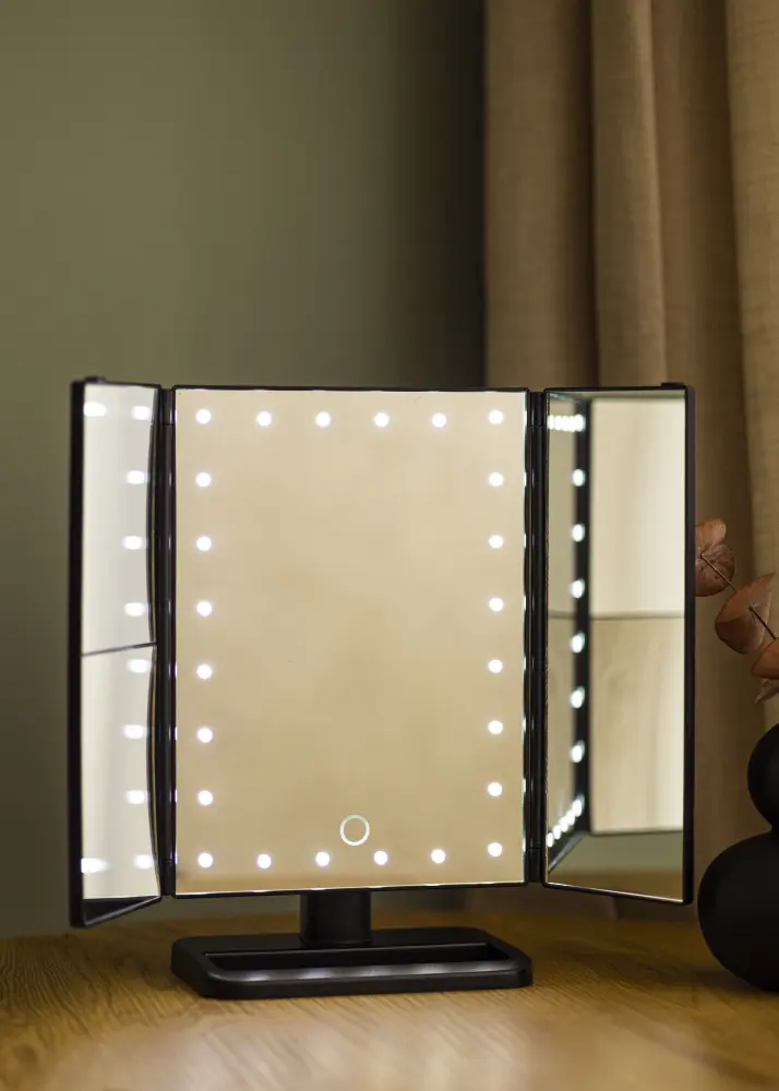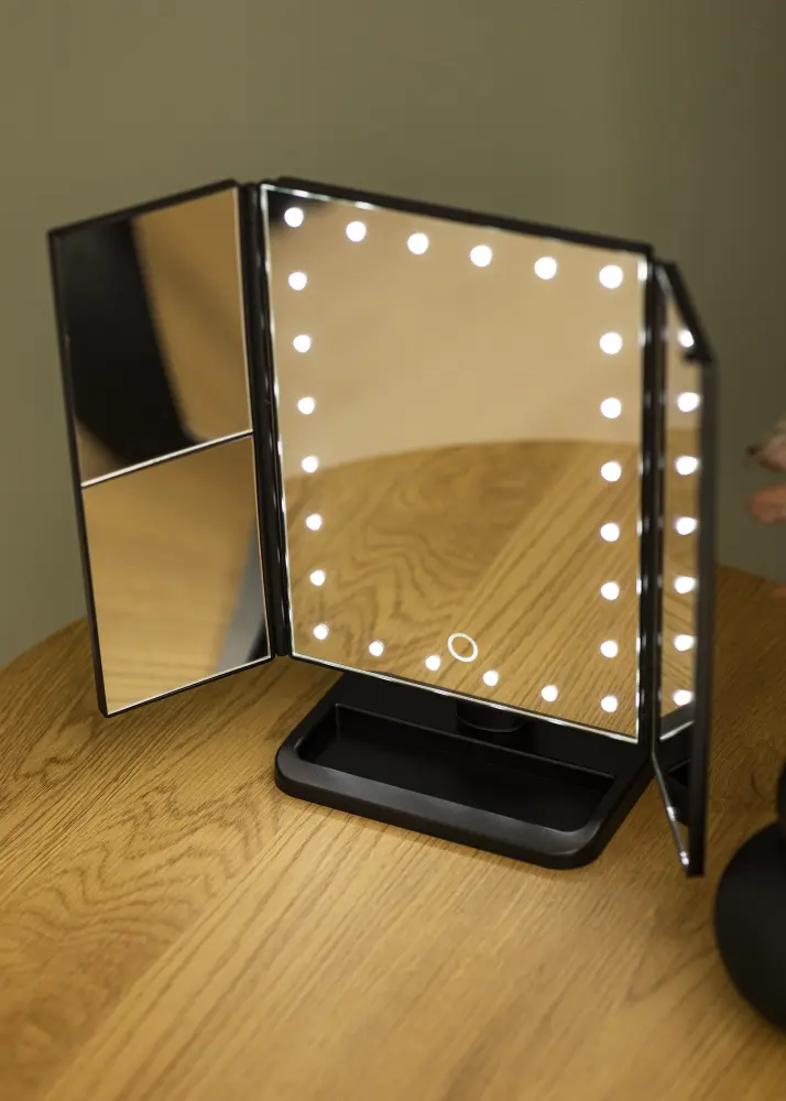 Ce miroir de maquillage est à la fois pratique et joli, avec sa couleur noire épurée et son éclairage LED. Il est conçu intelligemment avec des côtés repliables, vous permettant de définir l'angle que vous préférez lorsque vous vous reflétez. La grande surface de miroir au milieu est équipée d'un verre réfléchissant ordinaire et les plus petites surfaces réfléchissantes procurent un zoom x2, x3, et x10.