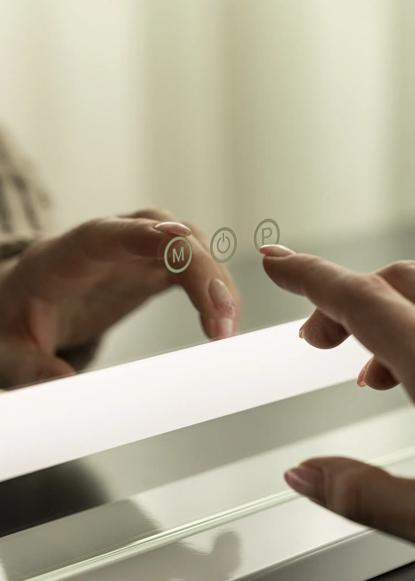Ce miroir est équipé d'une fonction tactile et vous allumez à la fois le miroir et ajustez l'éclairage à l'aide des boutons tactiles sur le miroir. Le bouton annoté d'un "M" permet de régler la température de couleur et le bouton annoté d'un "P" permet de régler la luminosité. Le raccordement électrique s'effectue avec une prise.