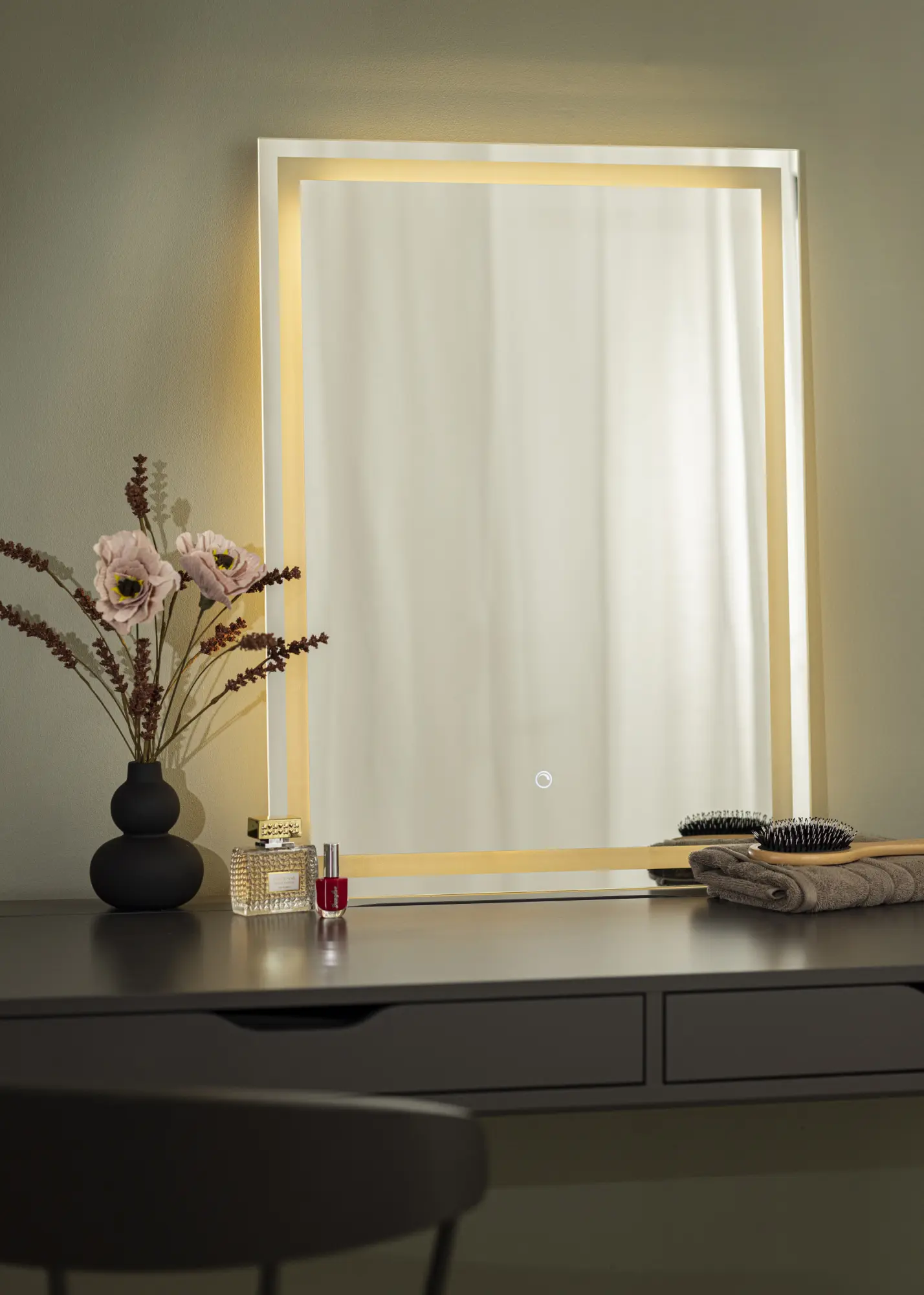 Vous désirez un miroir avec éclairage qui soit moderne et minimaliste ? Alors ce miroir est fait pour vous. Il est doté d'ampoules LED économes en énergie qui donnent une lumière uniforme, ce qui est idéal pour appliquer votre make-up ou simplement pour vous refléter durant la journée. L'éclairage est placé à l'arrière du miroir, mais illumine tel un élégant encadrement lumineux par les côtés du miroir. Pour régler la luminosité, maintenez enfoncé le bouton tactile situé sur le bord inférieur du miroir pendant quelques secondes.