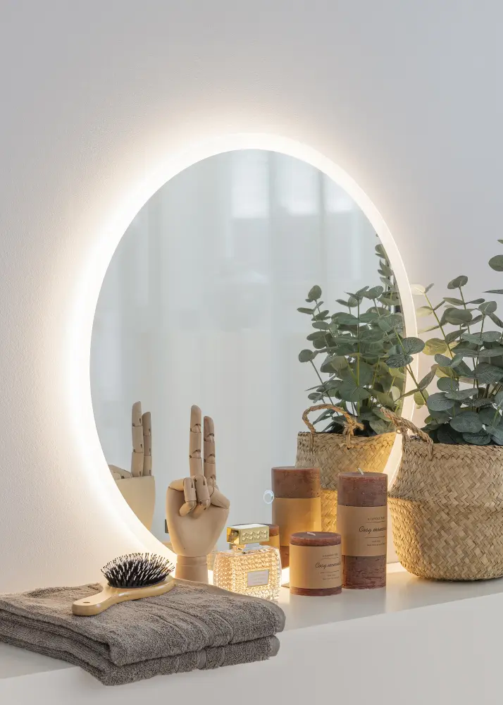 Voici un miroir de salle de bain rond classique et élégant. Le miroir est encadré par des bords dépolis avec un éclairage LED intégré. L'éclairage diffuse une lumière par l'arrière du miroir et projette une agréable lueur blanche chaude vers l'avant en 3000K. L'éclairage peut s'atténuer et vous pouvez facilement régler la puissance de la luminosité en maintenant le bouton enfoncé pendant quelques secondes. La prochaine fois que vous activez l'éclairage, le miroir se souviendra de la luminosité sur laquelle il a été réglé. Le miroir est doté de supports muraux et il est adapté pour les salles de bain. Le miroir de salle de bain est destiné à une installation fixe et se connecte à un interrupteur.