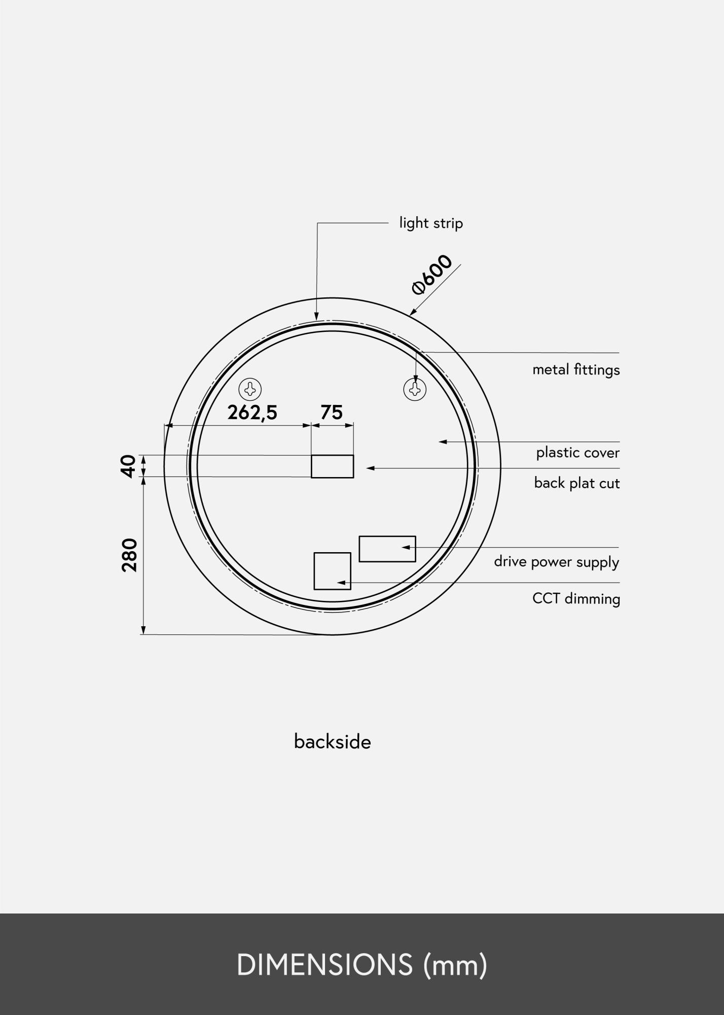 Le miroir est adapté pour les salles de bain mais grâce à son design intemporel et élégant, il a également fière allure sur les autres murs de la maison. Le miroir mesure 60 cm de diamètre, il ne fait que 3 cm d'épaisseur et est doté de supports muraux. Le miroir est destiné à une installation fixe et se connecte à un interrupteur. Afin que le miroir puisse fonctionner correctement, celui-ci doit être connecté à un interrupteur normal et non à un gradateur de lumière.