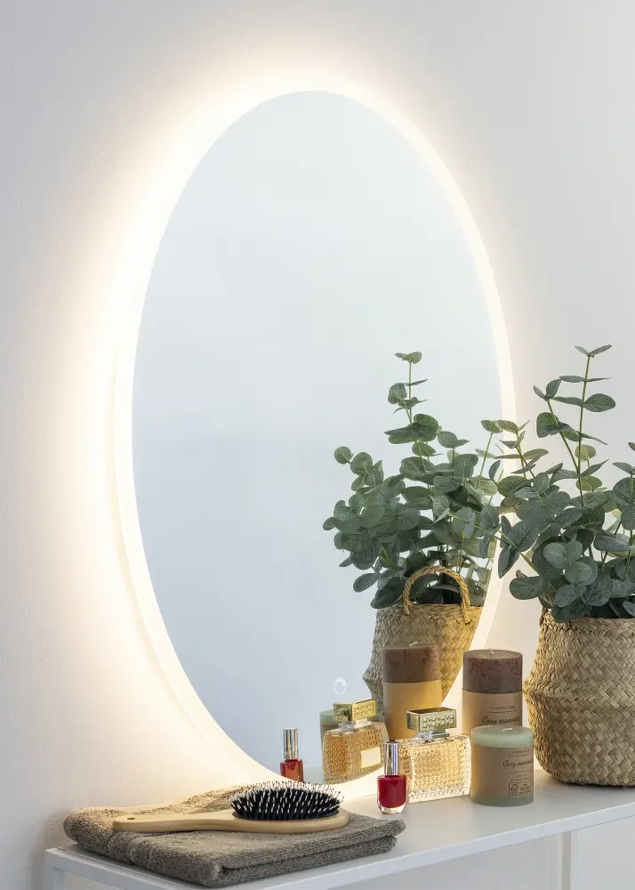 Voici un véritable miroir de salle de bain au design élégant avec sa forme ovale et son éclairage LED intégré ! L'éclairage LED intégré peut s'atténuer et la puissance s'ajuste facilement en appuyant sur le bouton tactile étanche disposé sur l'écran. L'éclairage projette une lumière dans une teinte blanche chaude en 3000K par l'arrière du miroir et projette une jolie lueur sur l'avant. La LED est une source de lumière écoénergétique qui fournit une lumière uniforme et naturelle. Le miroir est adapté pour les salles de bain. Le miroir de salle de bain est destiné à une installation fixe et se connecte à un interrupteur. Afin que le miroir puisse fonctionner correctement, celui-ci doit être connecté à un interrupteur normal et non à un gradateur de lumière.