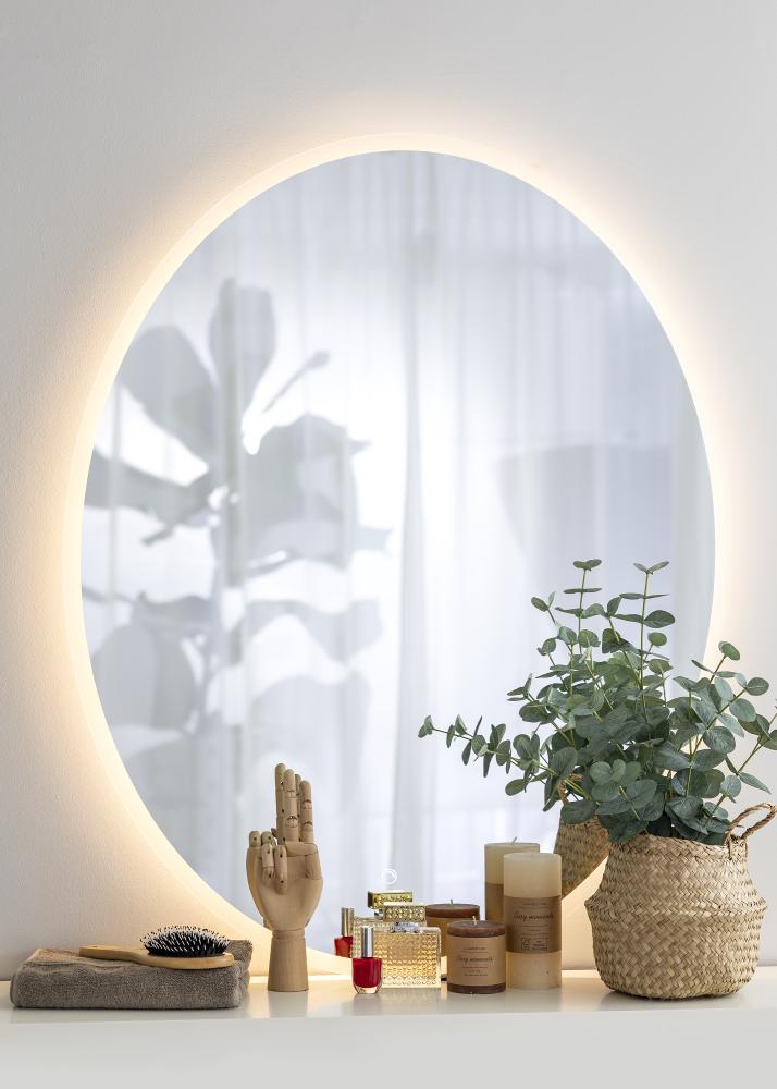 Voici un véritable miroir de salle de bain au design élégant avec sa forme ovale et son éclairage LED intégré ! L'éclairage LED intégré peut s'atténuer et la puissance s'ajuste facilement en appuyant sur le bouton tactile étanche disposé sur l'écran. L'éclairage projette une lumière dans une teinte blanche chaude en 3000K par l'arrière du miroir et projette une jolie lueur sur l'avant. La LED est une source de lumière écoénergétique qui fournit une lumière uniforme et naturelle. Le miroir est adapté pour les salles de bain. Le miroir de salle de bain est destiné à une installation fixe et se connecte à un interrupteur. Afin que le miroir puisse fonctionner correctement, celui-ci doit être connecté à un interrupteur normal et non à un gradateur de lumière.