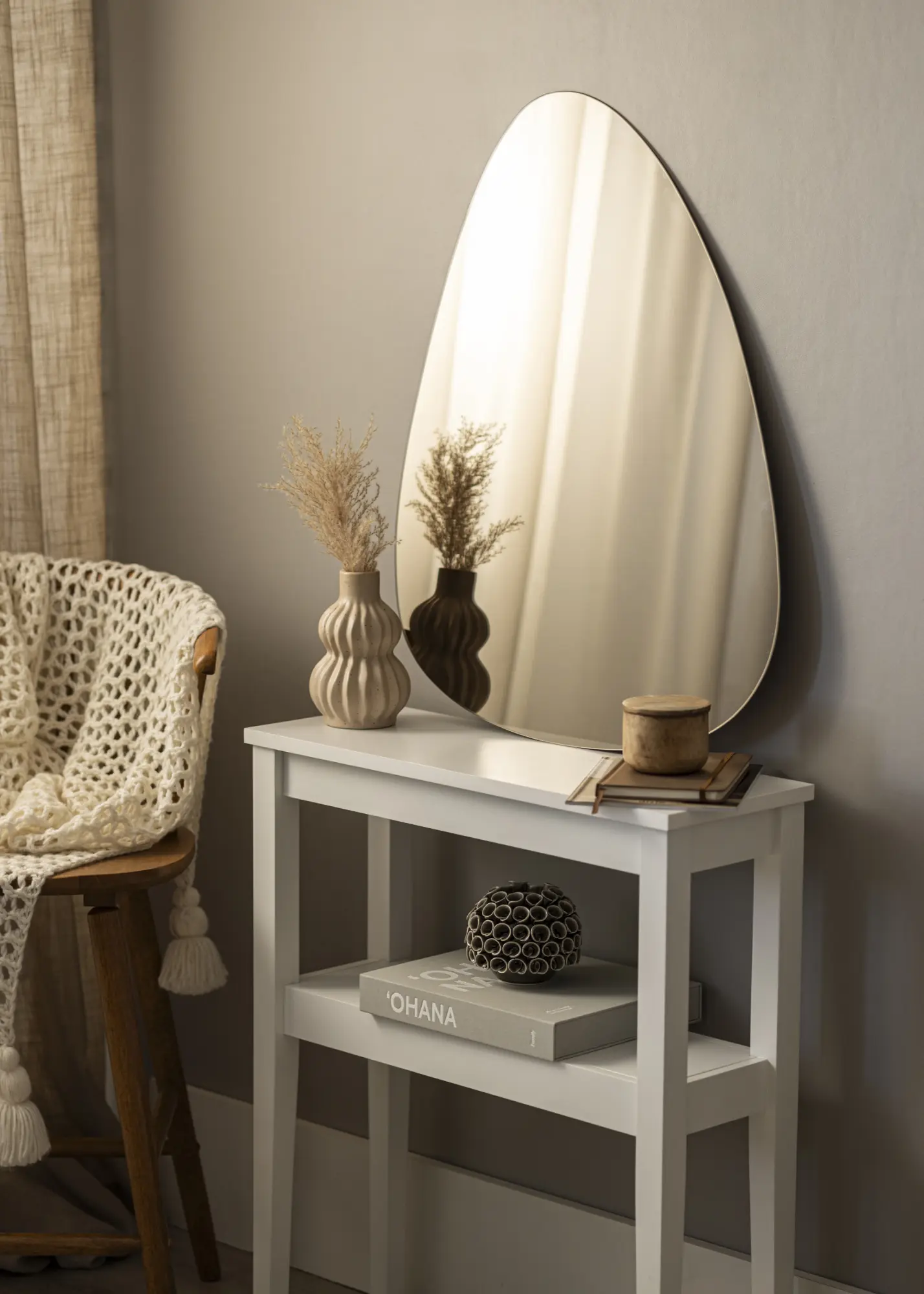 Ce miroir asymétrique deviendra un détail d'intérieur très esthétique et tendance dans votre maison ! En plus de son design original en forme d'œuf, ce miroir se dote également d'un élégant verre réfléchissant teinté bronze qui améliore encore son aspect moderne et s'harmonise magnifiquement avec de nombreuses combinaisons de couleurs différentes. La forme douce combinée à la finesse de ce miroir dépourvu de cadre, fait de l'ensemble un objet d'une rare élégance et de bon goût. Idéal comme décoration murale fonctionnelle et tendance dans le salon, l'entrée ou la chambre.
