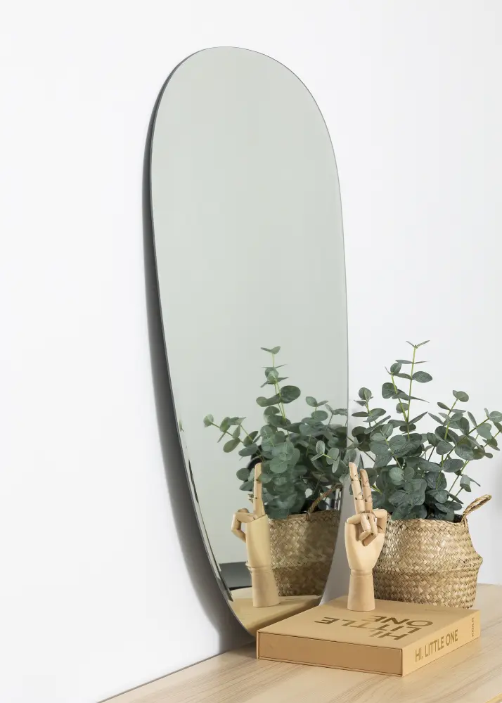 Ce miroir asymétrique de KAILA ajoutera une touche moderne à votre décoration intérieure. Le miroir a une forme douce qui peut presque être décrite comme un ovale inégal. Le miroir mural est fin et sans cadre, ce qui renforce la sensation d'élégance. Il a par ailleurs un bord à facettes très élégant.