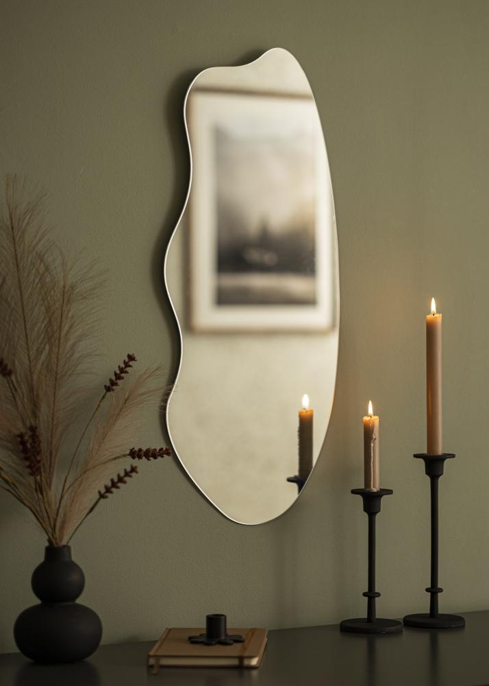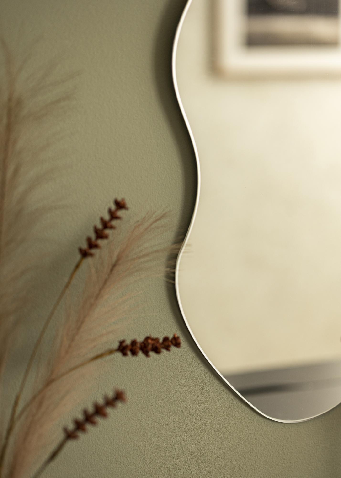 Un miroir mural asymétrique deviendra un détail décoratif assez tape-à-l'œil dans n'importe quel intérieur. Ce miroir est conçu dans une forme unique, avec un long côté arrondi et un autre ondulé qui, ensemble, forment un ensemble original et élégant. Le miroir s'intègre aussi bien dans l'entrée que dans le salon et peut également faire office de miroir de salle de bain tendance.