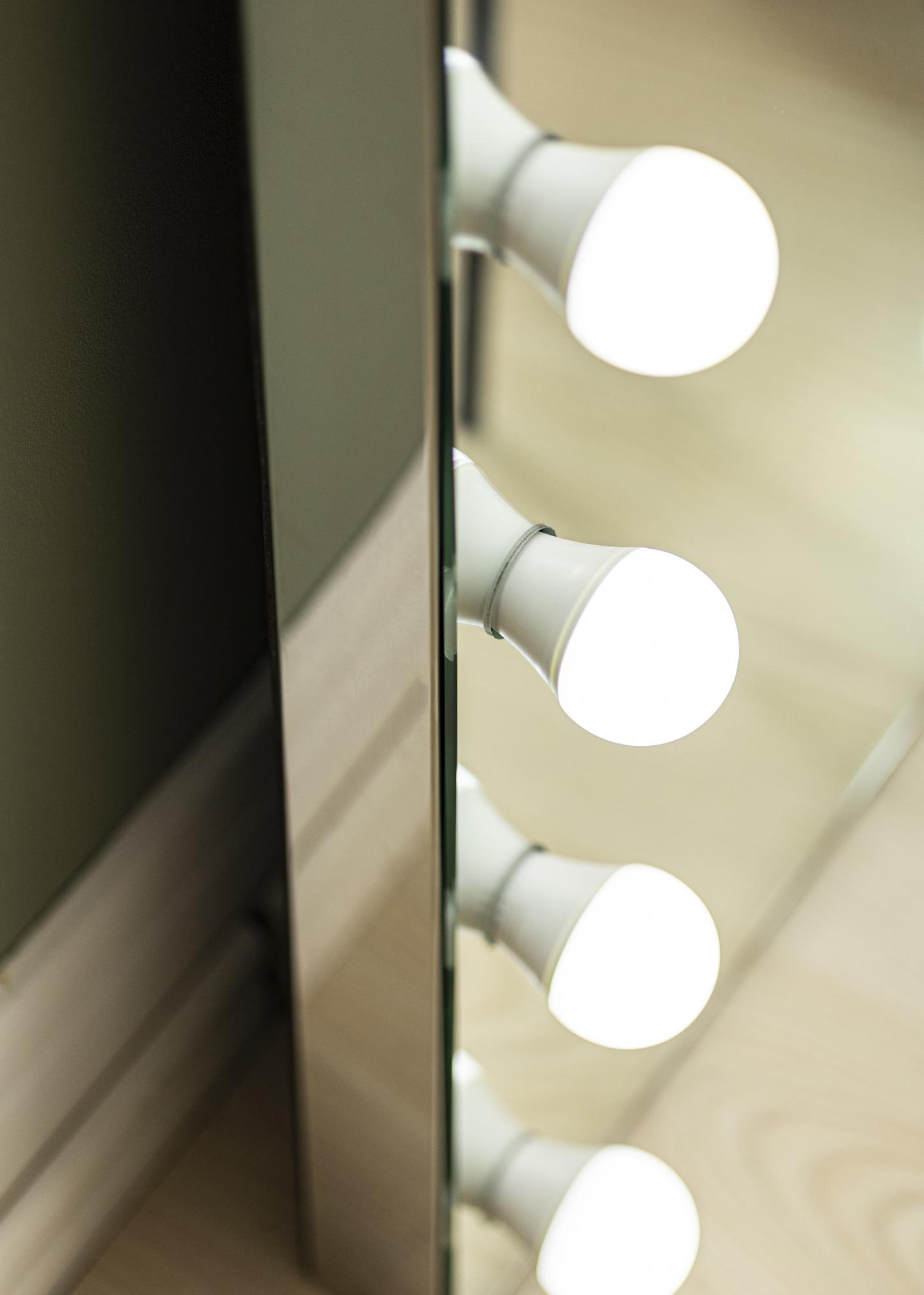 Ce miroir d'entrée dispose d'un éclairage LED intégré sous la forme de 22 ampoules LED qui encadrent magnifiquement la surface du miroir et donne au miroir son aspect si luxueux. Sur un long côté du miroir se trouve un petit bouton rotatif que vous pouvez utiliser pour atténuer l'éclairage pour obtenir la luminosité souhaitée.
