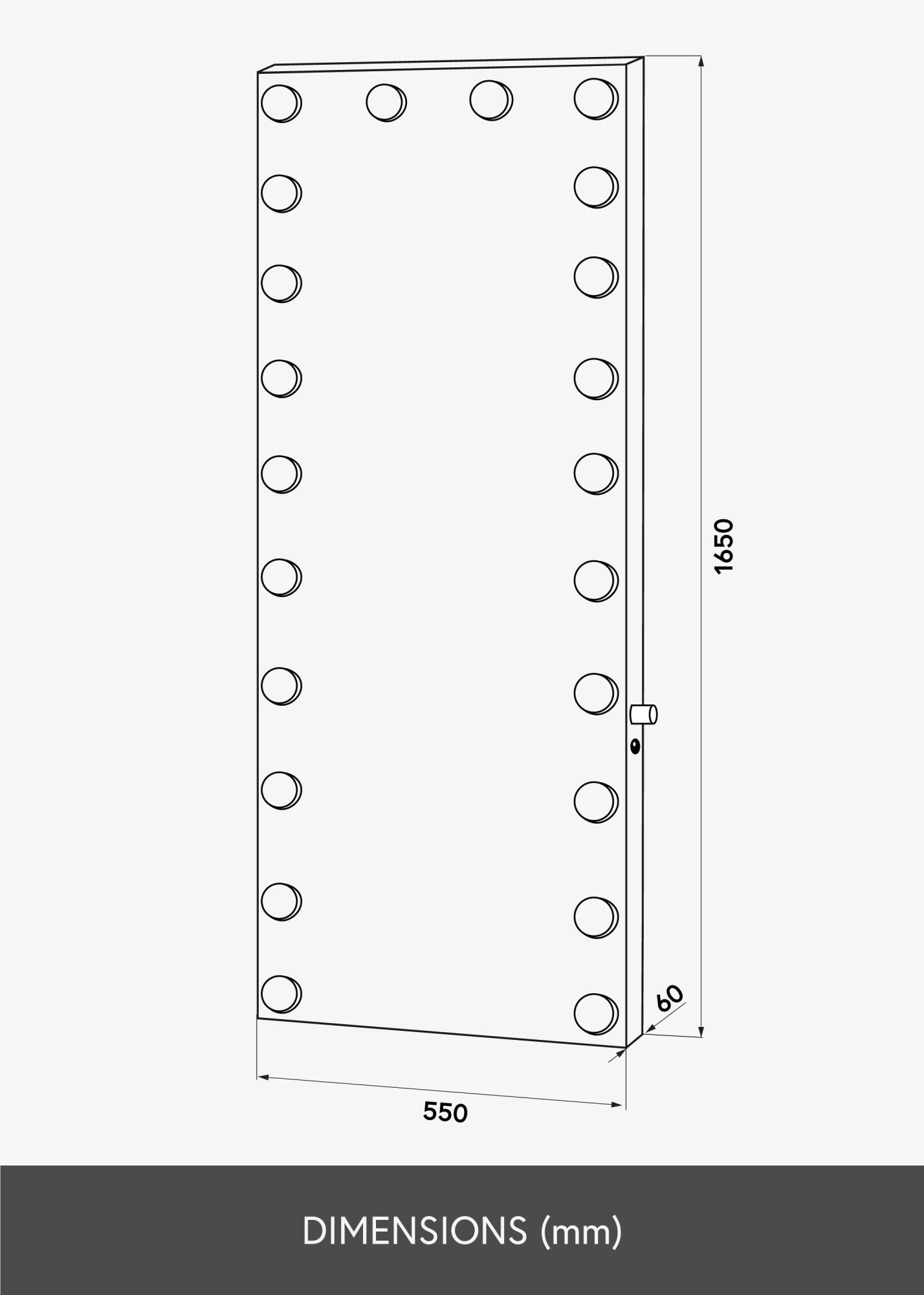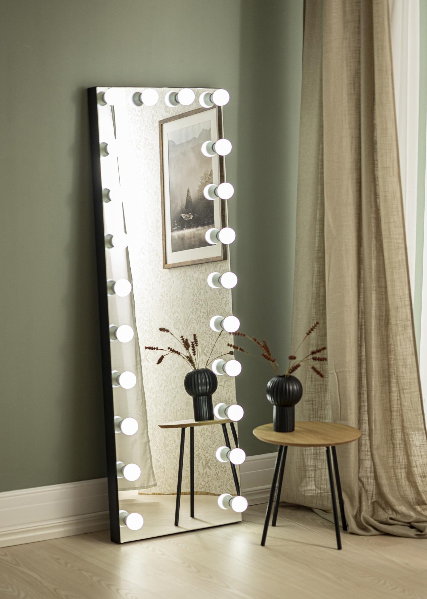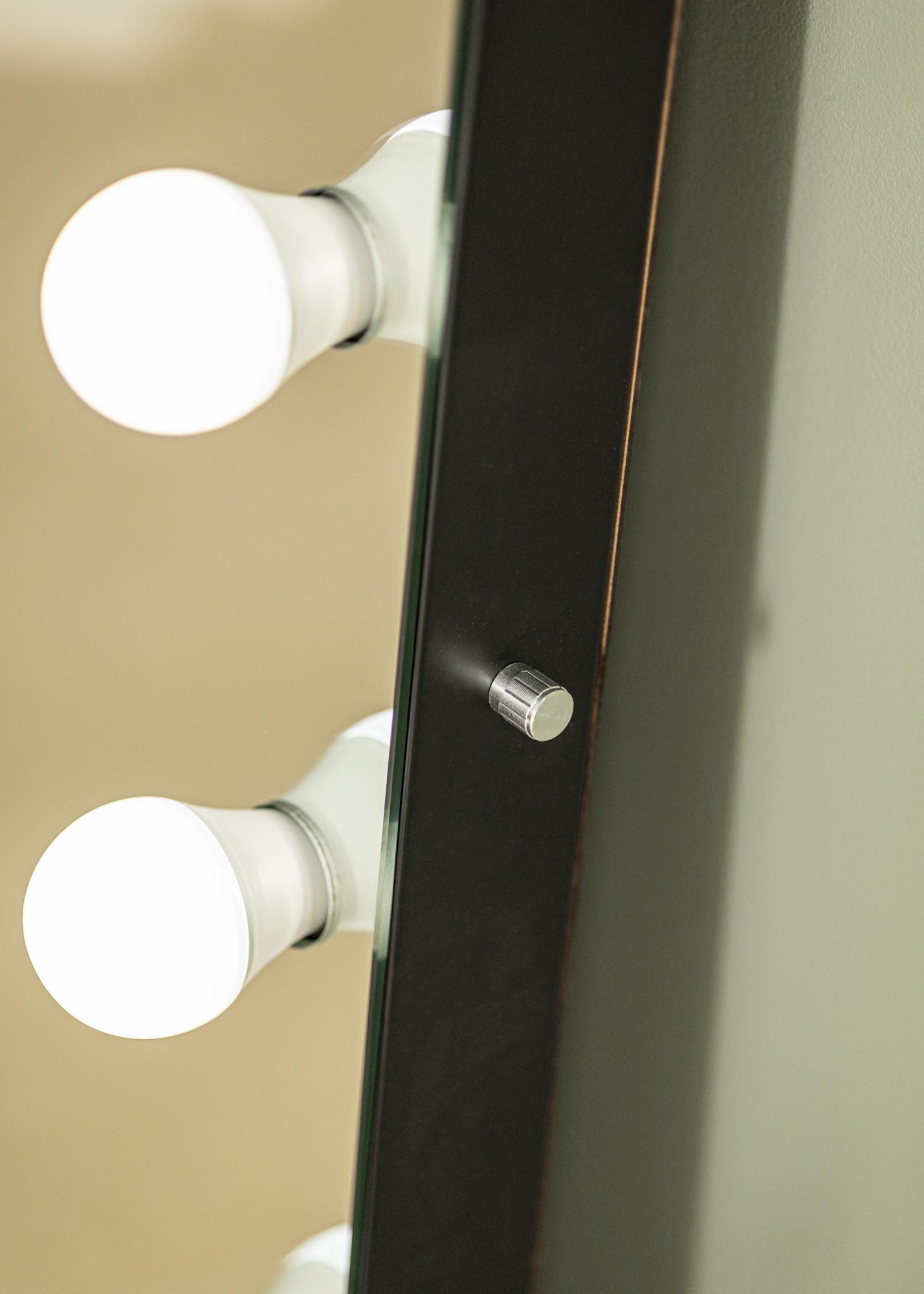 Le miroir mural est doté de 22 grosses ampoules LED qui encadrent joliment la surface réfléchissante et qui contribuent à l'aspect glamour du miroir. À l'aide avec d'un petit bouton situé sur le côté long du miroir, vous pouvez atténuer la luminosité à votre guise. Le miroir se branche à une prise.