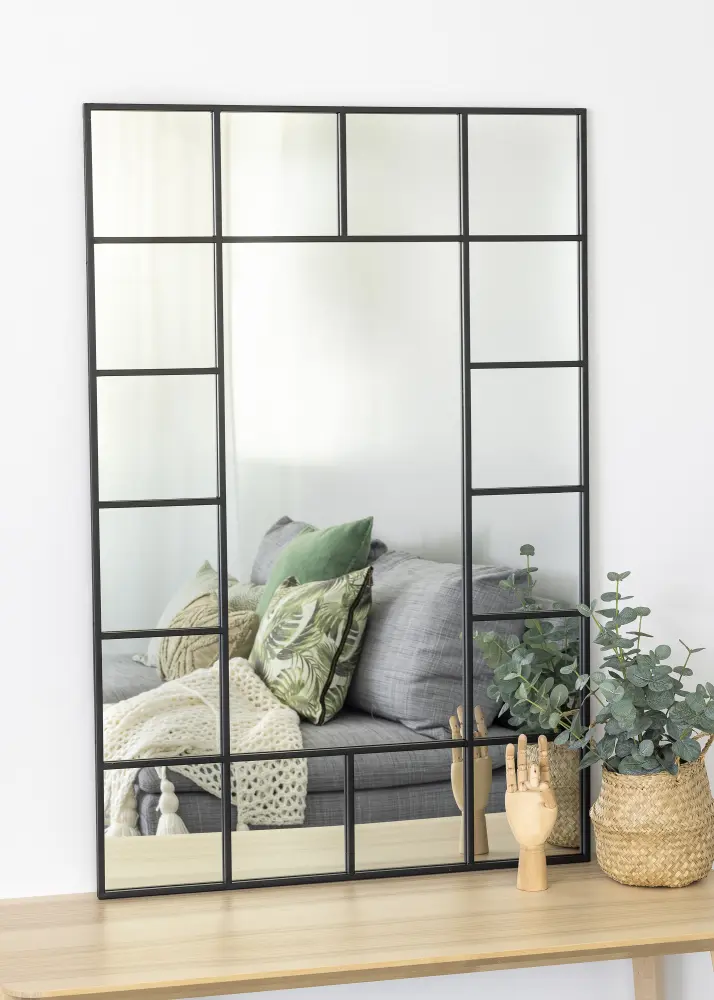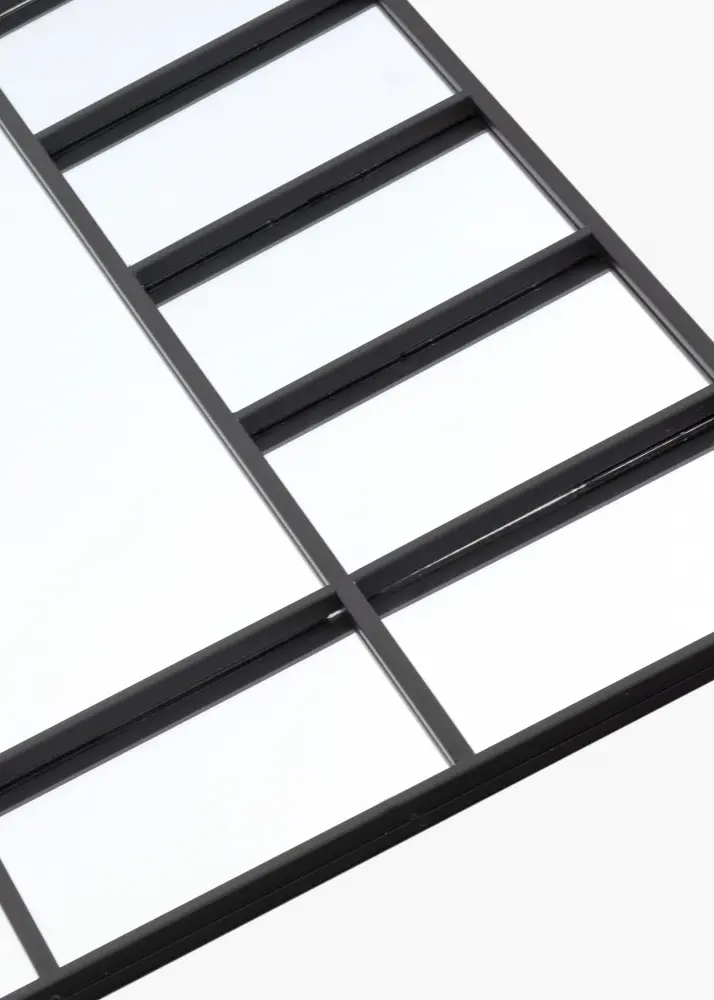 Ce beau miroir par KAILA a un design rappelant une jolie fenêtre. Dans le miroir, il y a plusieurs carreaux différents qui encadrent joliment une plus grande surface de miroir au milieu. Les carreaux sont joliment encadrés par de fines lignes noires en métal qui donnent au miroir un caractère légèrement industriel tout en étant élégant. Un support mural pour l'accrochage au mur est disponible, mais le miroir est également très joli lorsqu'il est appuyé contre le mur. Le miroir mesure 80x120 cm.