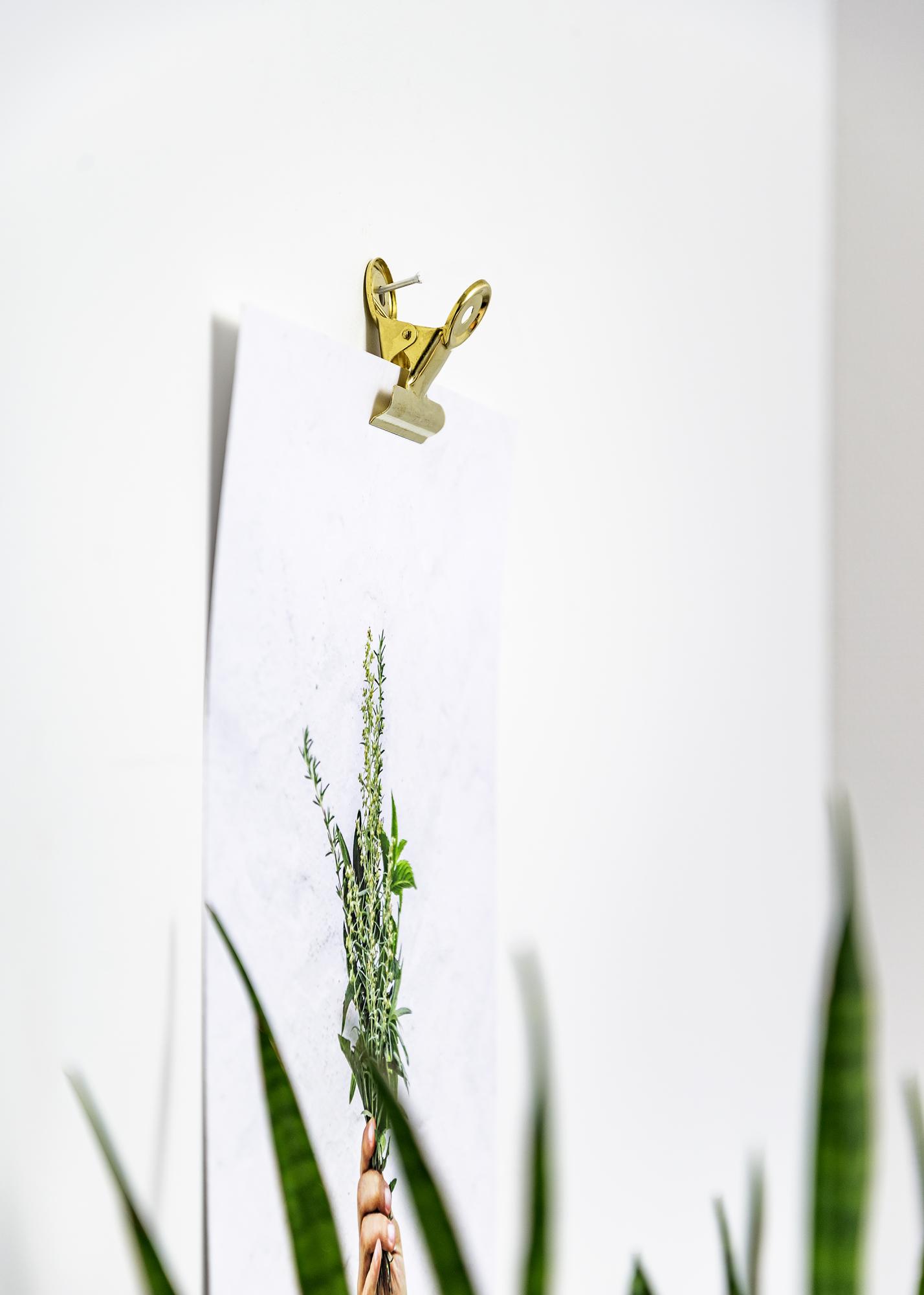 Une pince en métal dans une finition dorée élégante et brillante qui donne à vos posters et affiches une suspension tendance et minimaliste. Le design de la pince pour poster est élégant et les trous dans le haut rond permettent de la fixer facilement au mur sur un petit clou ou une vis. L'ouverture de la pince a une bonne prise qui vous permet d'accrocher le papier le plus fin, alors qu'elle est également flexible et permet la suspension de motifs d'épaisseur variable. Si vous souhaitez accrocher un grand poster, utilisez deux pinces en métal pour de meilleurs résultats.