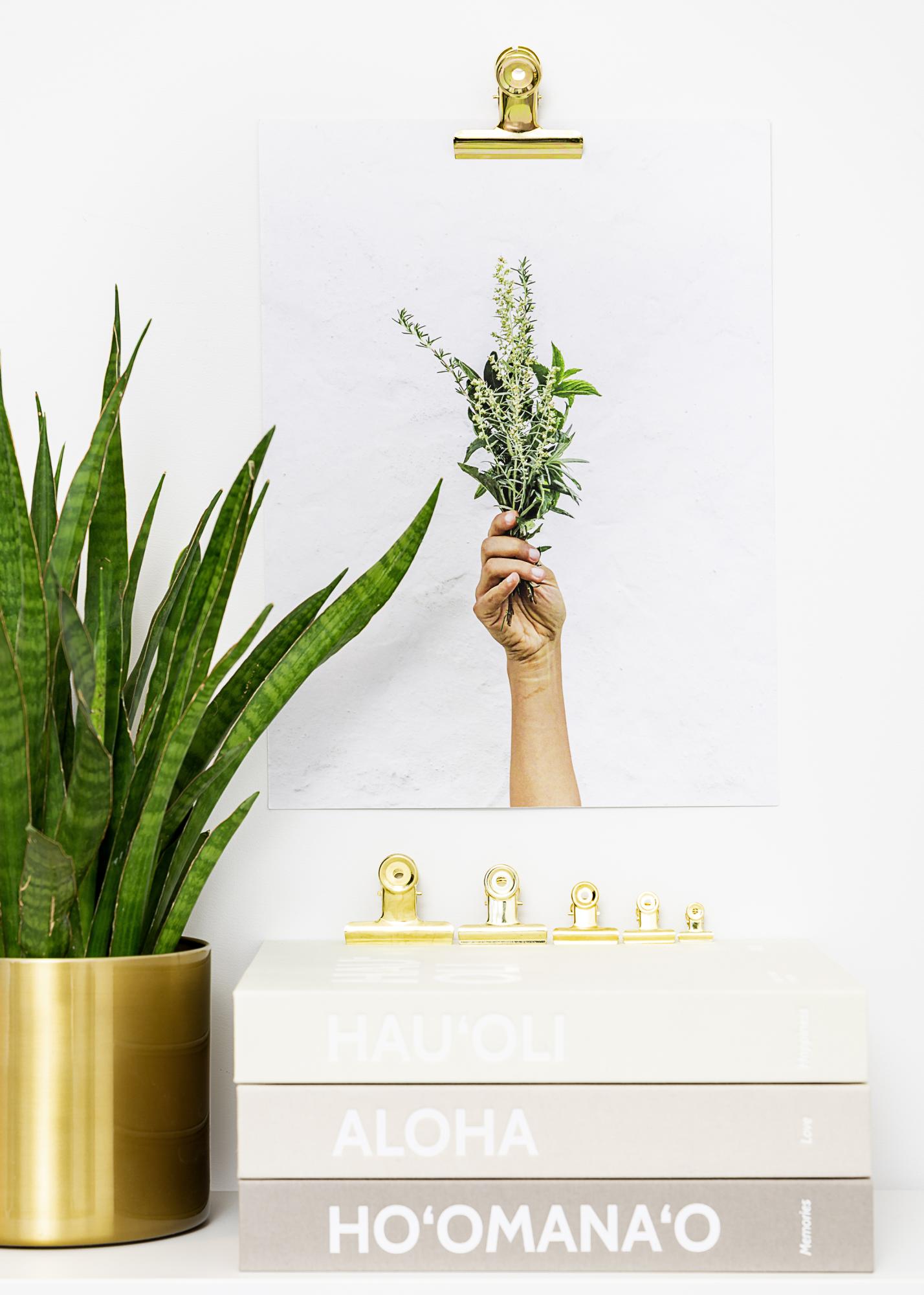 Une pince en métal dans une finition dorée élégante et brillante qui donne à vos posters et affiches une suspension tendance et minimaliste. Le design de la pince pour poster est élégant et les trous dans le haut rond permettent de la fixer facilement au mur sur un petit clou ou une vis. L'ouverture de la pince a une bonne prise qui vous permet d'accrocher le papier le plus fin, alors qu'elle est également flexible et permet la suspension de motifs d'épaisseur variable. Si vous souhaitez accrocher un grand poster, utilisez deux pinces en métal pour de meilleurs résultats.