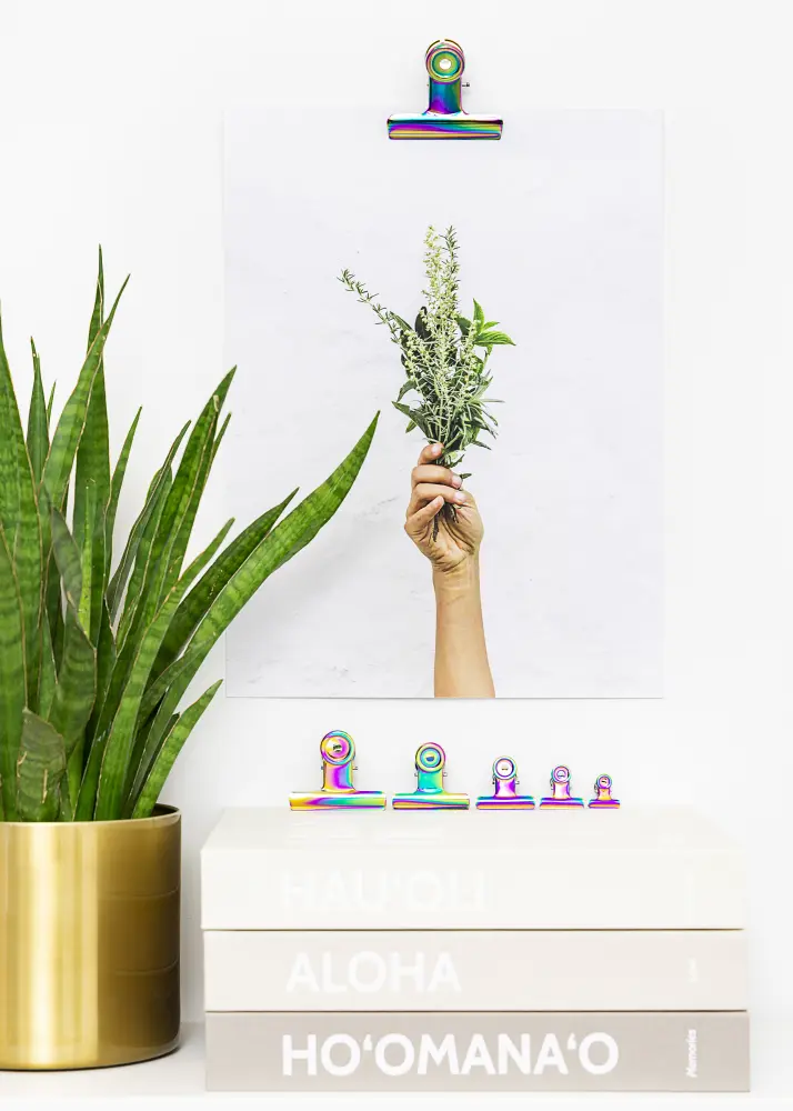 Une charmante pince en métal de couleur arc-en-ciel à la finition brillante qui donne à vos posters et affiches une suspension tendance et légèrement différente. L'ouverture solide mais flexible de la pince pour poster vous permet de fixer le papier le plus fin ainsi que des posters avec une épaisseur légèrement supérieure. Et si vous avez un grand poster à suspendre, utilisez simplement deux pinces en métal. Le design de la pince pour poster est élégant et épuré, et grâce aux trous dans le haut rond, vous pouvez facilement la placer sur le mur à l'aide d'un petit clou ou d'une vis.