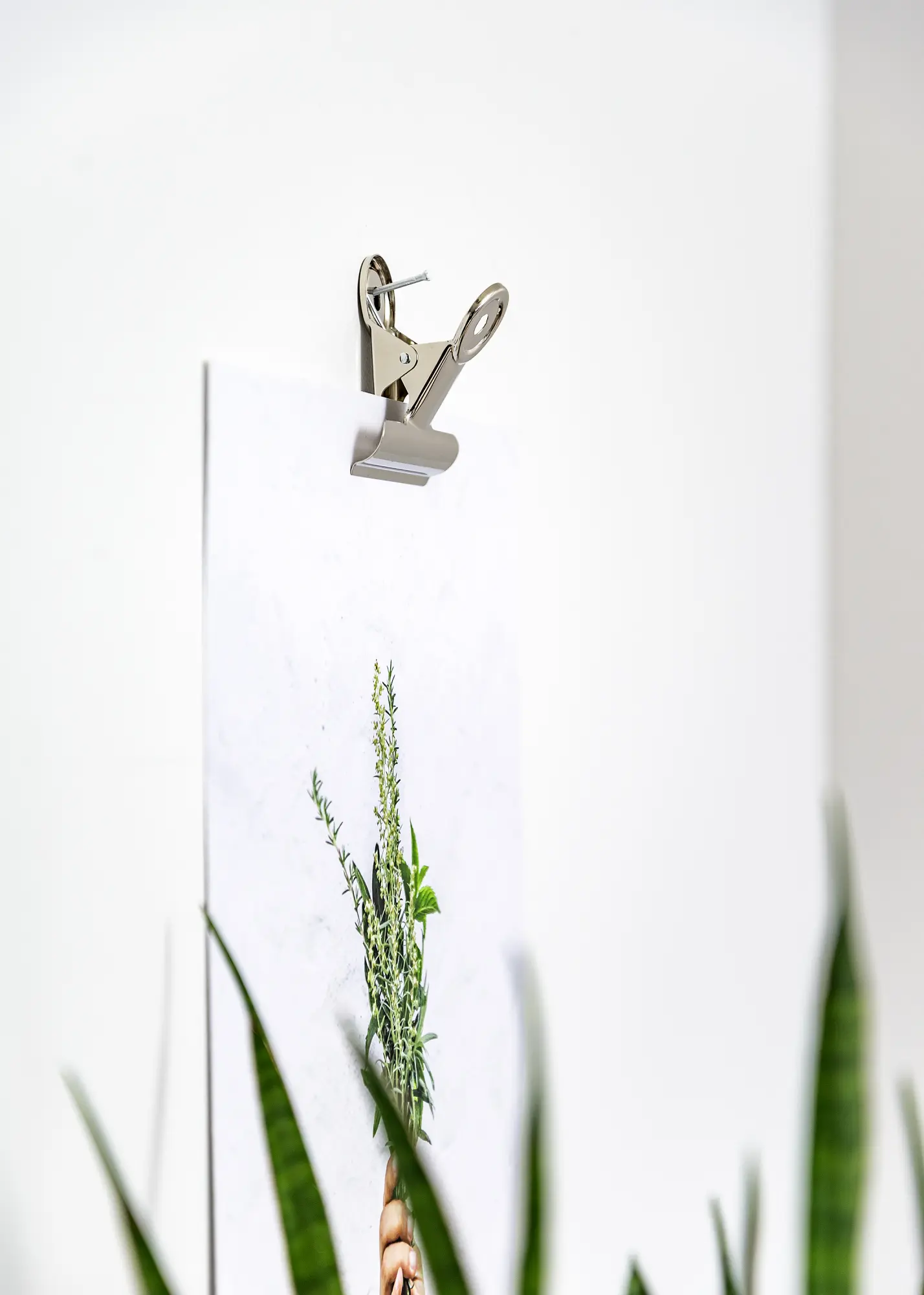 Cette pince en métal a une finition argentée moderne et brillante et est l'outil parfait pour créer une suspension tendance et minimaliste de posters ou d'affiches. L'ouverture flexible et appropriée de la pince vous permet de suspendre des motifs d'épaisseur variable, même le papier le plus fin. Et si vous avez un grand poster, il n'y a qu'à utiliser deux pinces en métal. Le design de la pince pour poster est épuré et élégant, et les trous dans le haut rond de la pince rendent le montage sur le mur simple et pratique : tout ce dont vous avez besoin est un petit clou ou une vis.