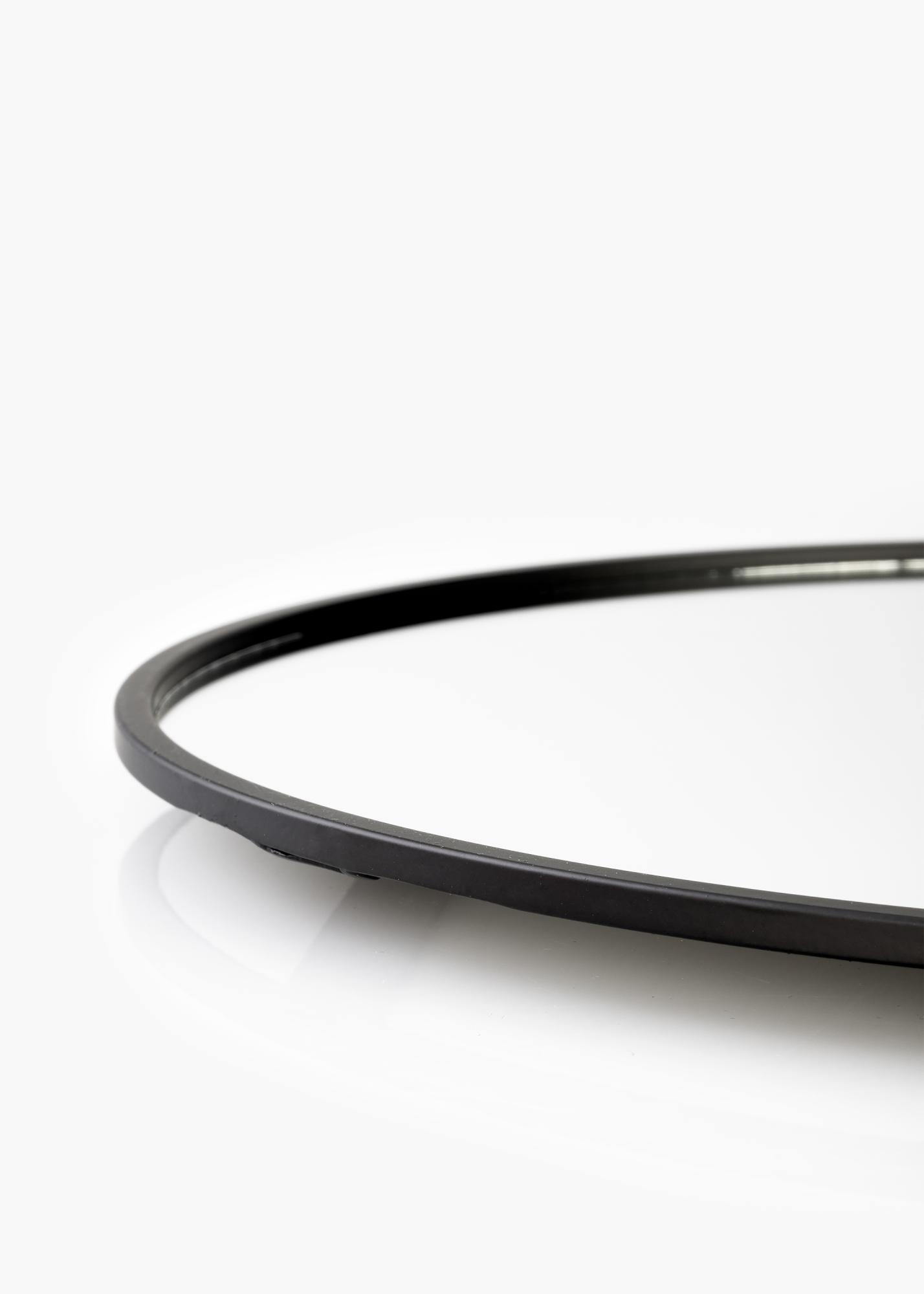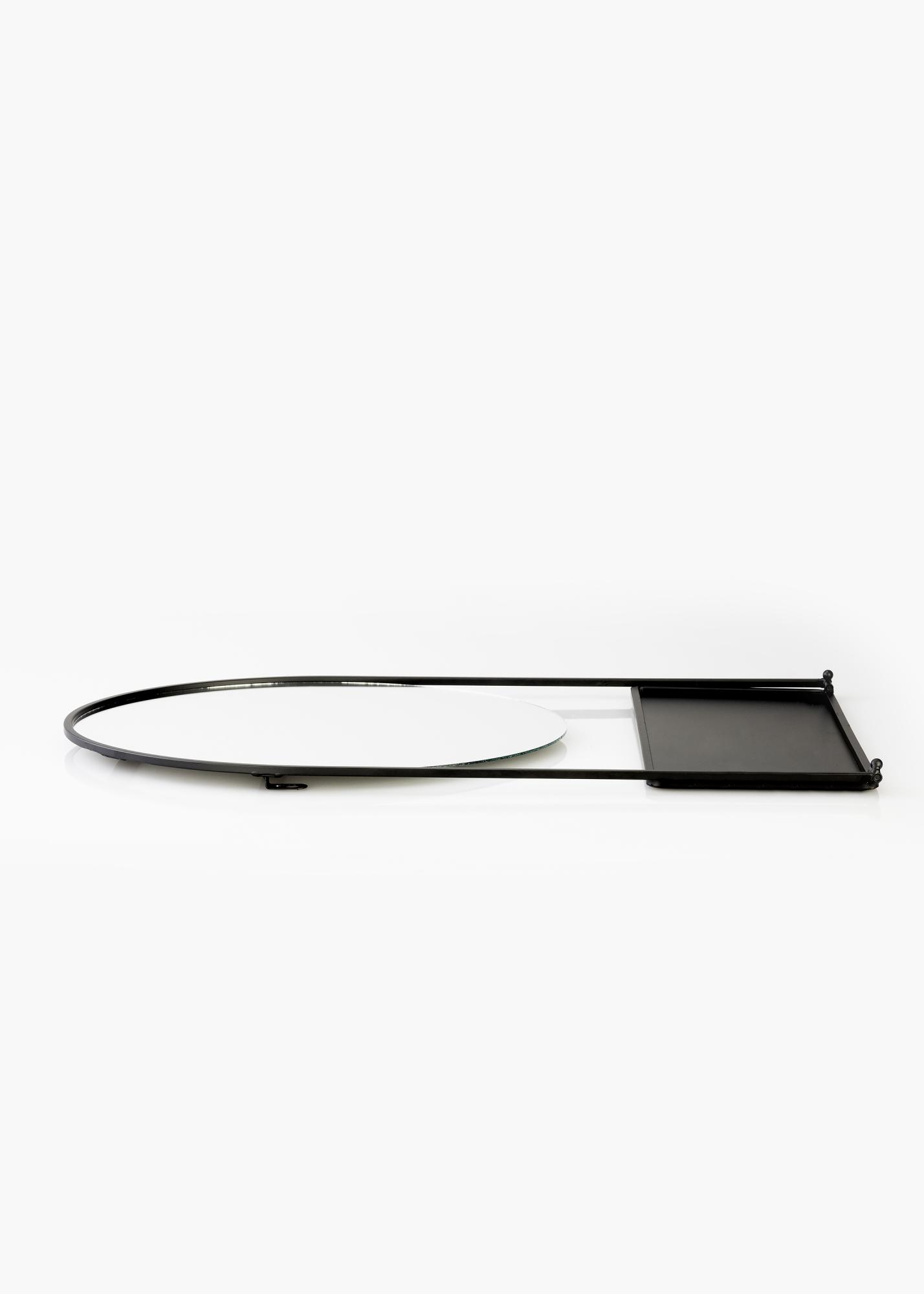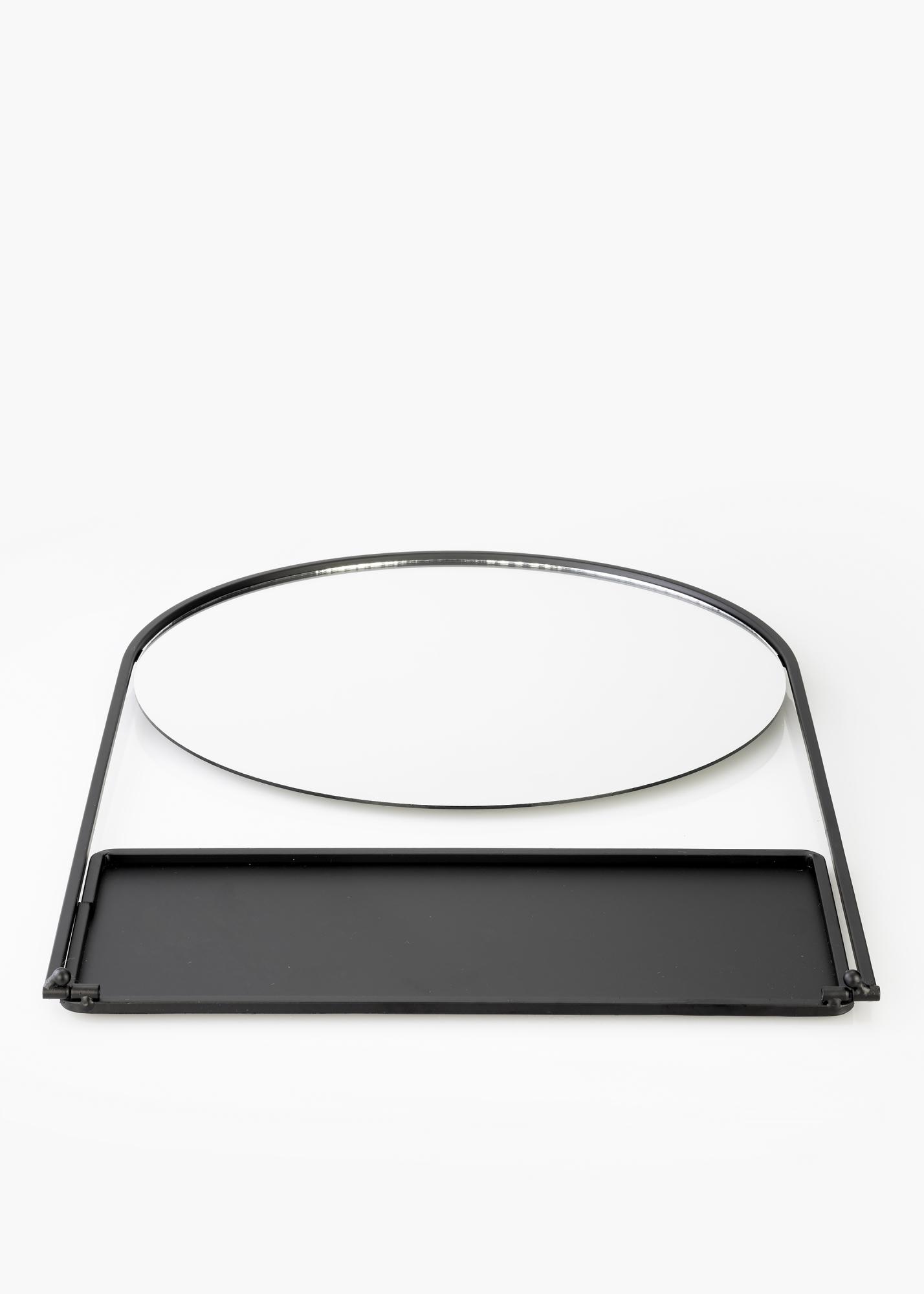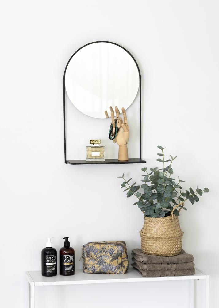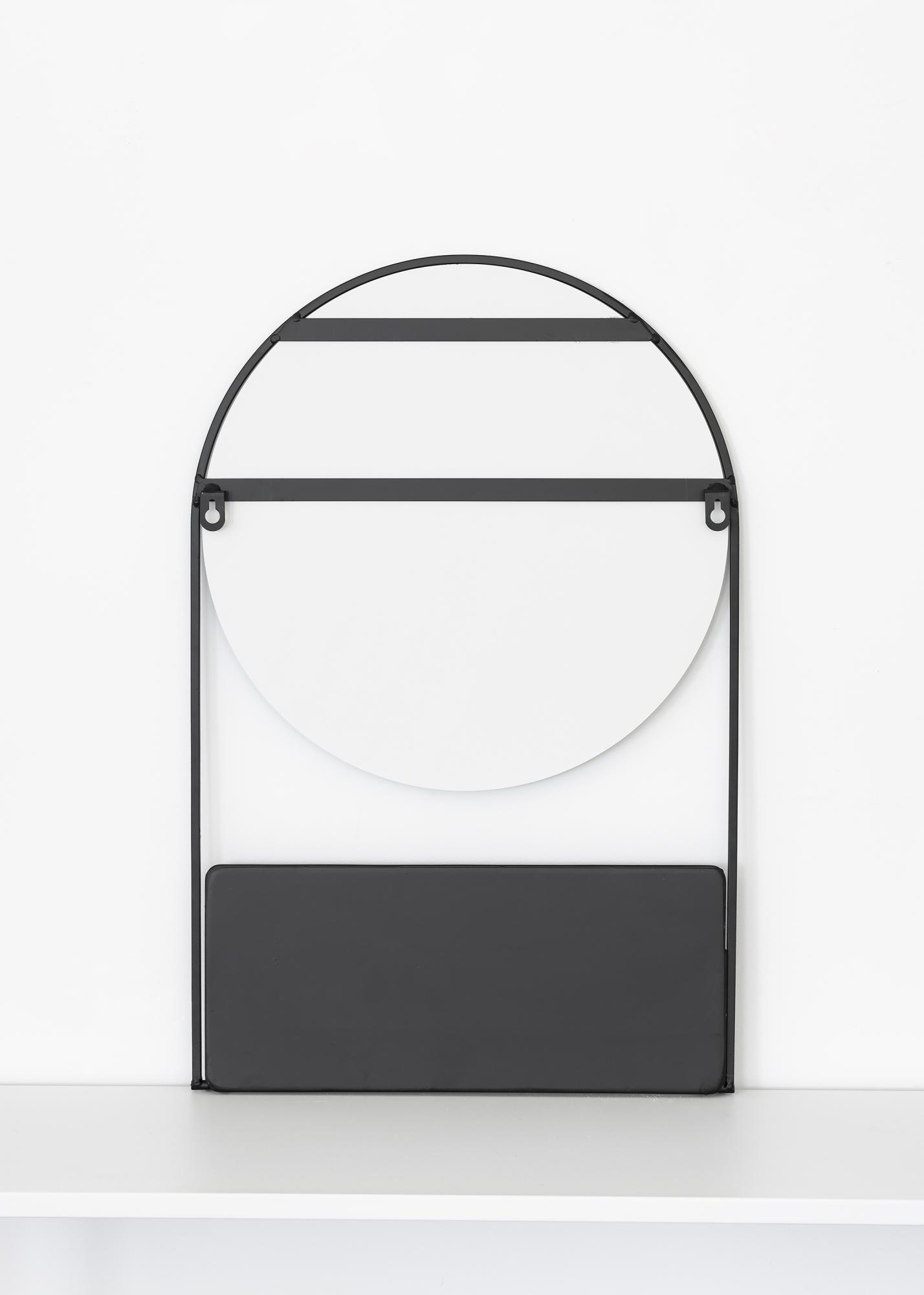 Ce miroir mural esthétique avec étagère est de conception nordique par KAILA. Le miroir se présente dans une teinte noire et il est conçu en métal. La surface même du miroir est ronde et mesure 35 cm de diamètre. Autour de la surface du miroir se trouve un bord en métal noir et en bas une étagère - idéal pour pouvoir y déposer une belle décoration ou comme rangement pour le maquillage ! Le miroir mesure 35x55 cm et a des supports muraux.