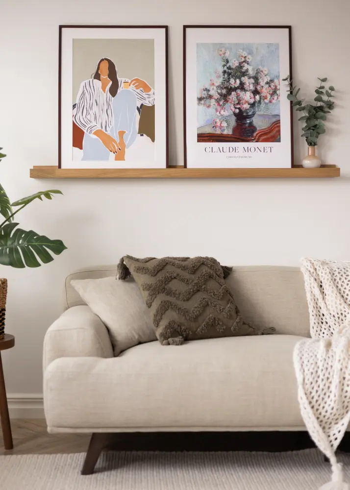 Notez qu'étant fabriquée en chêne massif, des variations naturelles de couleur peuvent survenir. L'étagère à tableaux est traitée avec une huile transparente protectrice.