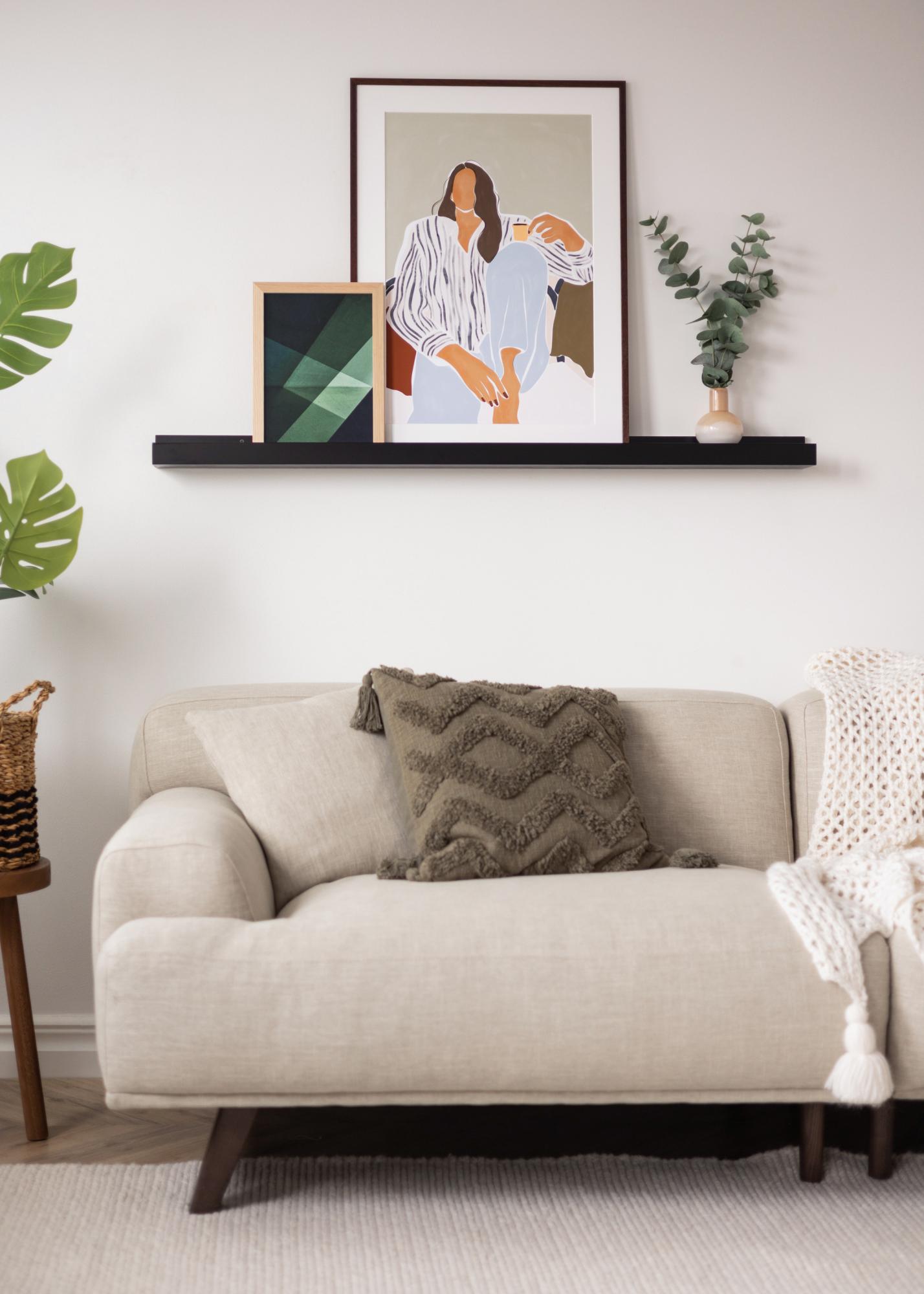 Montrez et variez votre art mural facilement et avec style grâce à une élégante étagère à tableaux ! Cette étagère est fabriquée en MDF et est peinte en noir tendance avec une belle finition semi-brillante. L'étagère à tableaux a un design épuré avec des lignes droites et simples et un sentiment minimaliste. Le plateau de l'étagère a une rainure fraisée au milieu qui sert de support à vos tableaux et leur donne un bel angle lorsqu'ils sont inclinés contre le mur.