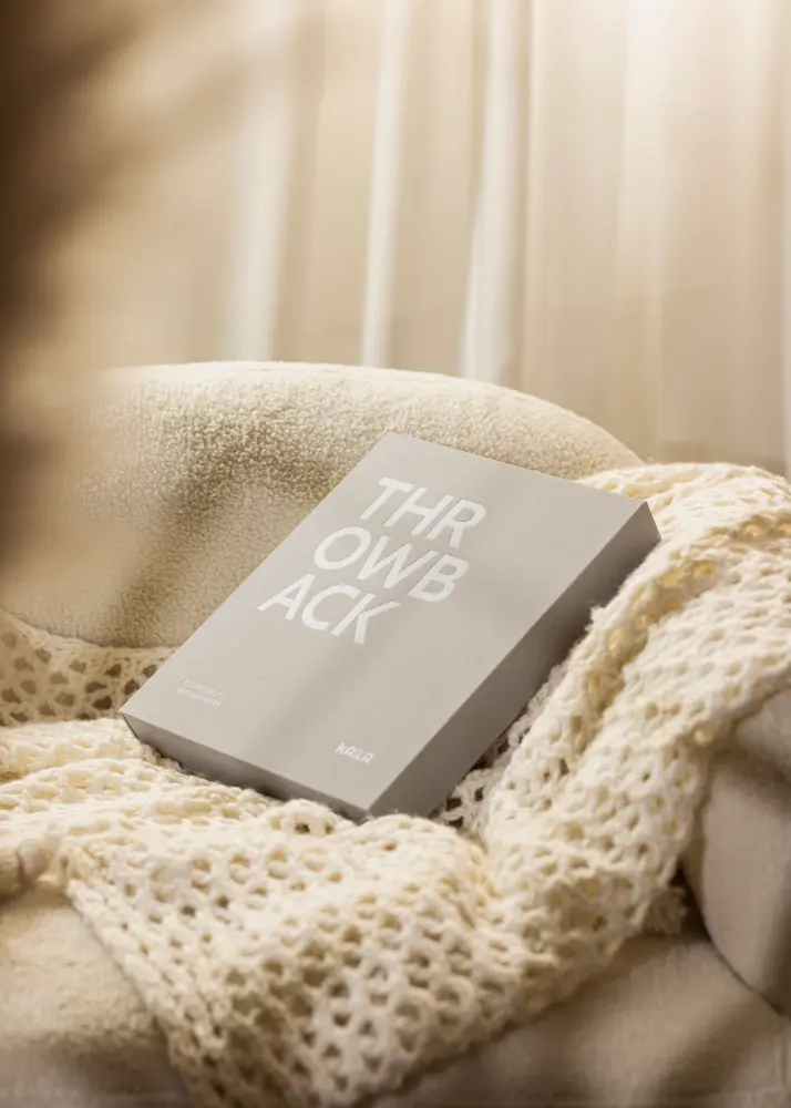Voici un album photo très tendance emballé de façon luxueuse sous la forme d'un beau Coffee Table Book – également appelé Coffee Table Photo Album. L'album photo est conçu sous la forme d'une boîte exclusive à ouvrir pour découvrir son contenu. La couverture est élégamment revêtue d'un textile gris et d'un imprimé blanc faisant figurer le texte ”THROWBACK” décorant à la fois la couverture et la tranche de l'album. Le concept familier du "throwback" (rétrospective) donne à l'album photo une sensation moderne et légèrement impertinente ce qui le démarque vraiment des styles d'autres albums classiques. L'album est même doté d'un sous-titre mentionnant ”A collection of past experiences” imprimé sur le coin gauche inférieur.