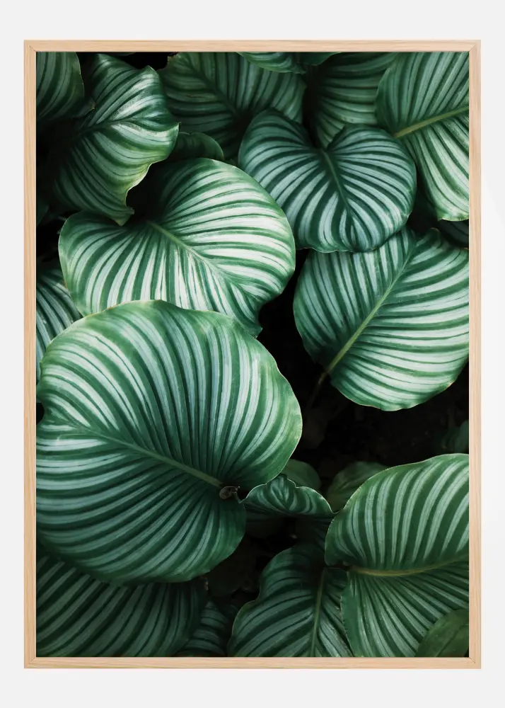 Une magnifique affiche avec vue aérienne sur des feuilles de Calathea vert foncé. La lumière du soleil se reflète sur les feuilles, créant une lumière intense. Les différentes nuances de vert forment un décor intense, ce qui en fait un tirage idéal à accrocher dans un salon bien fourni en plantes.
