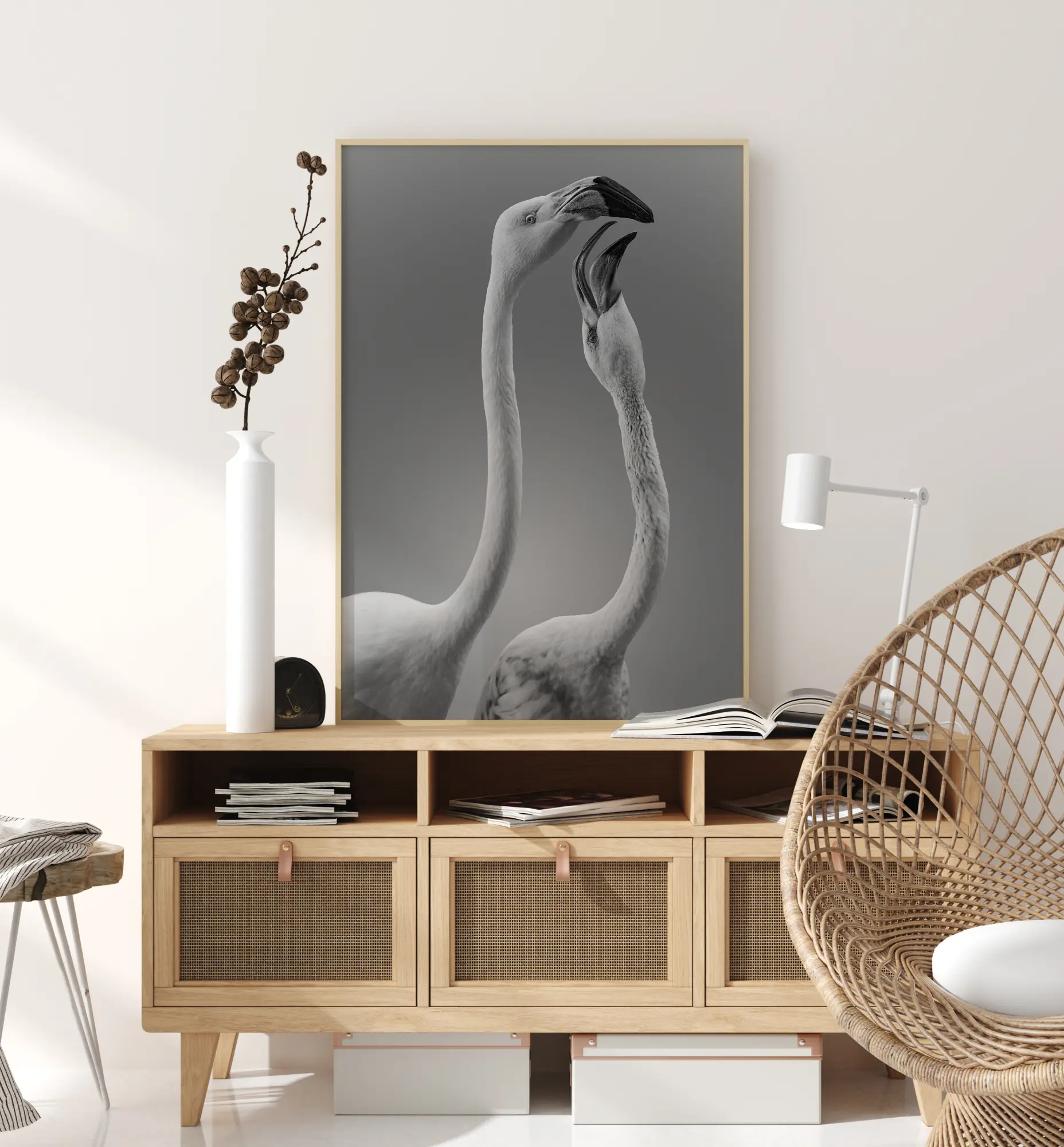 Une affiche de la nature représentant deux flamants roses sui se penchent pour s'embrasser. Les gris subtils de cette photo en noir et blanc s'équilibrent parfaitement avec les tons pastel. Ces deux oiseaux vous apportent sérénité.