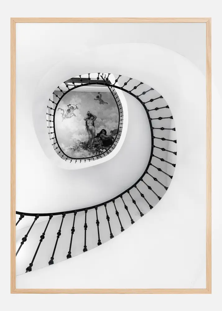 Und magnifique affiche en noir et blanc d'escalier en colimaçon. Grâce à une rampe en fer forgé noir, ce bel escalier en colimaçon vous conduit jusqu'à une ravissante fresque représentant des femmes nues et des chérubins. Accroché sur un mur blanc uni, ce poster crée un sentiment d'immensité.