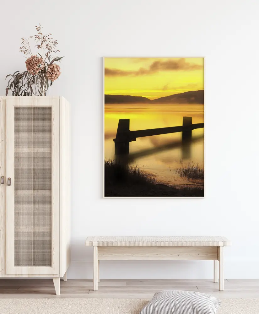 Une affiche panoramique d'un magnifique lac doré au coucher du soleil. Les tons orange vibrants brillent sur le lac, créant une atmosphère chaleureuse et apaisante. Les collines sombres au loin disparaissent presque au centre de l'image, donnant un sentiment de profondeur. Au premier plan, une structure en bois fait saillie sur l'eau. Appréciez le silence de cette image.